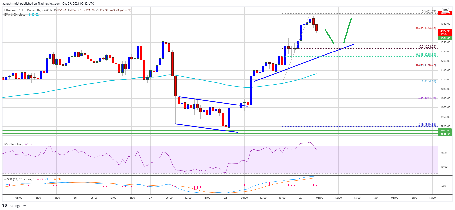 - Ethereum started a fresh increase above the $4,200 and $4,300 resistance levels.