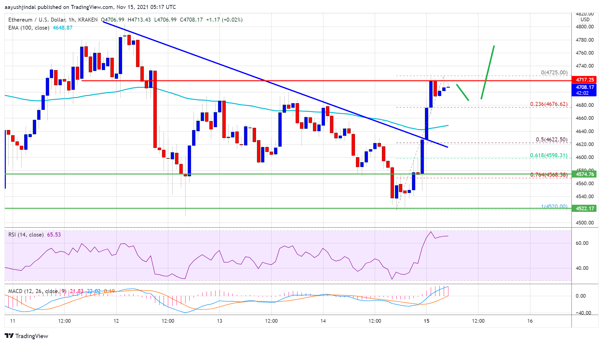 There was a break above a major bearish trend line with resistance near $4,630 on the hourly chart of ETH/USD. The pair climbed above the $4,700 level, but it is now facing resistance near the $4,725 level.