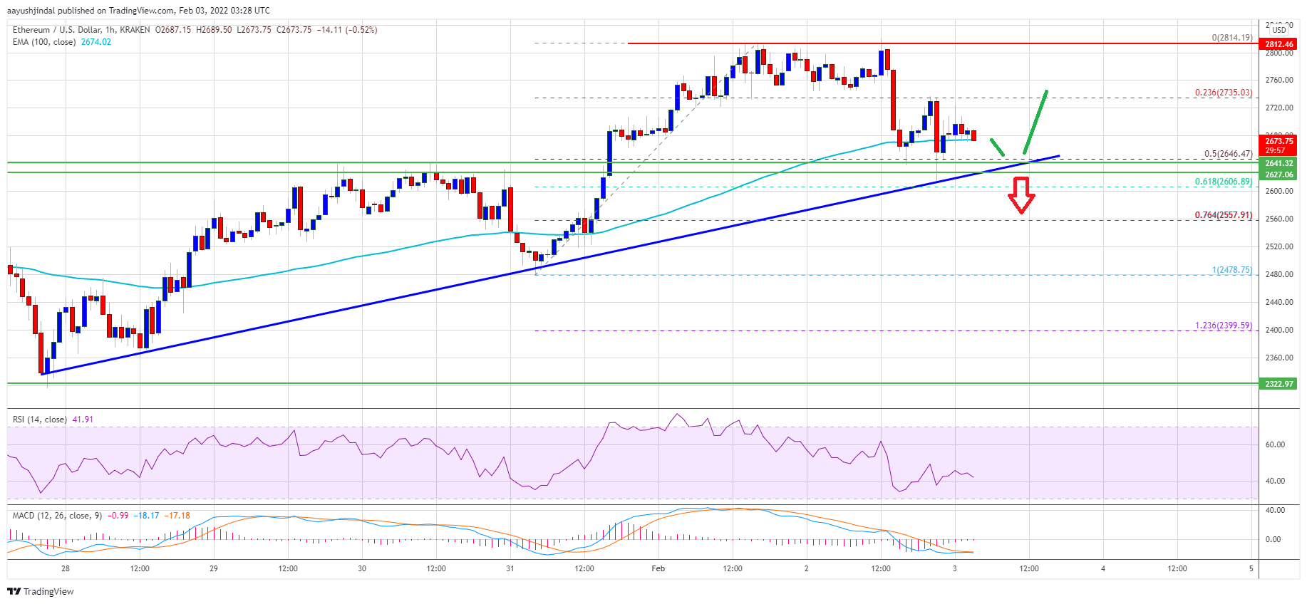 - There is a crucial bullish trend line forming with support near $2,645 on the hourly chart of ETH/USD (data feed via Kraken).