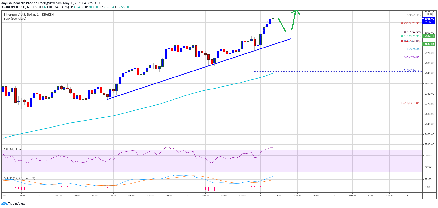 Ethereum extended its rally and it traded to a new all-time high above $3,000 against the US Dollar. ETH price is showing signs of more upsides towards $3,100 and $3,150.