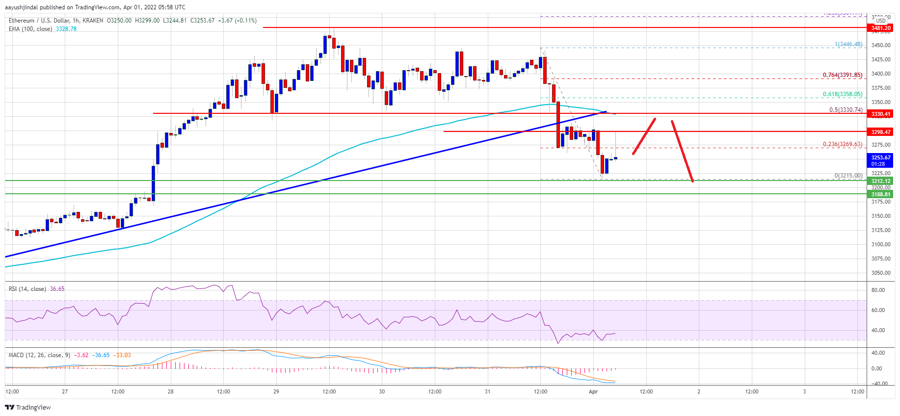 - The price is now trading below $3,300 and the 100 hourly simple moving average.