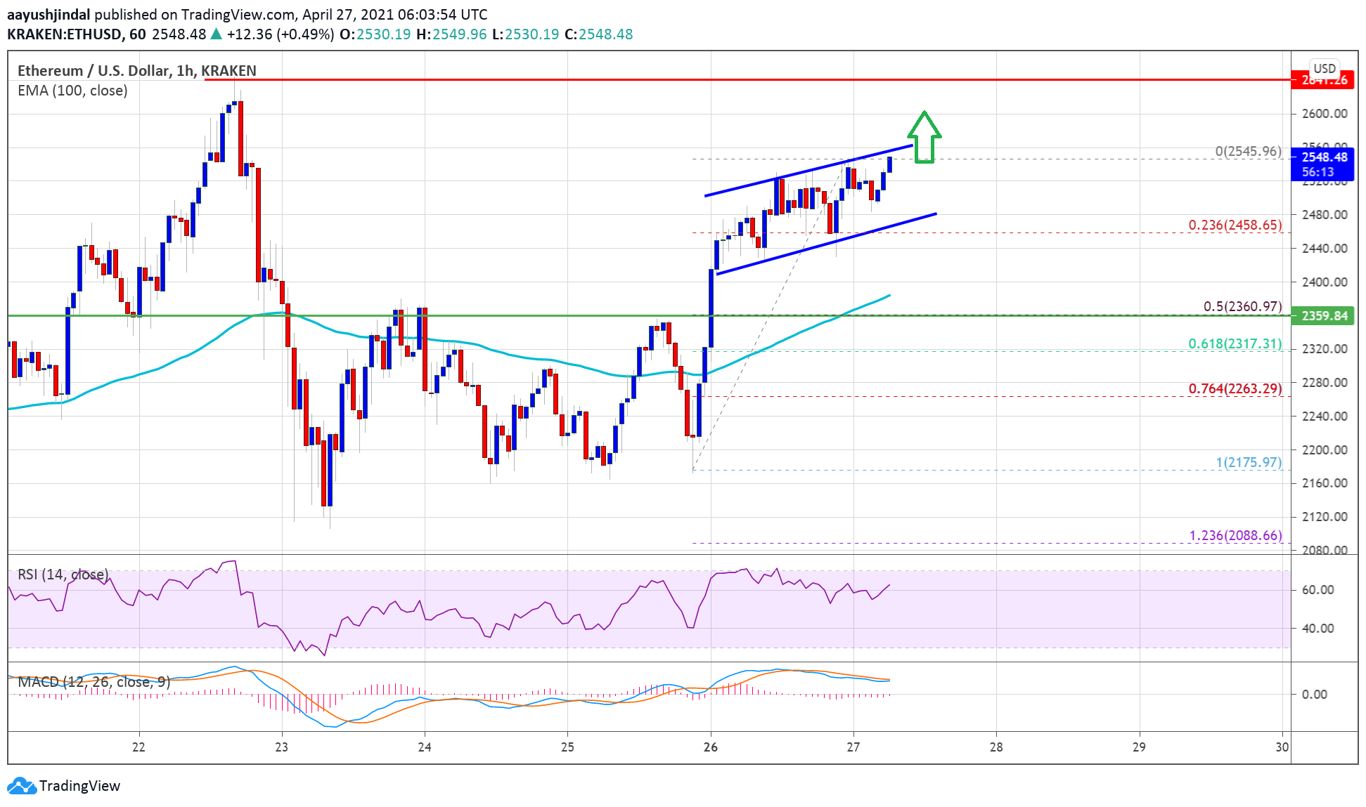 There was a clear break above the $2,500 level and the price tested the $2,550 zone. A high is formed near $2,545 and the price is consolidating gains. There is a key rising channel forming with support near $2,480 on the hourly chart of ETH/USD.