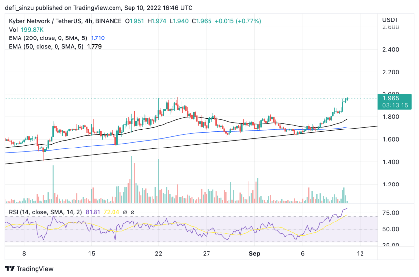 On the daily timeframe, the price of KNC is trading at $1.96, attempting to break and hold above the 200 Exponential Moving Averages (EMA). The price of $1.95 corresponds to the 200 EMA, which is a barrier to the price of KNC.