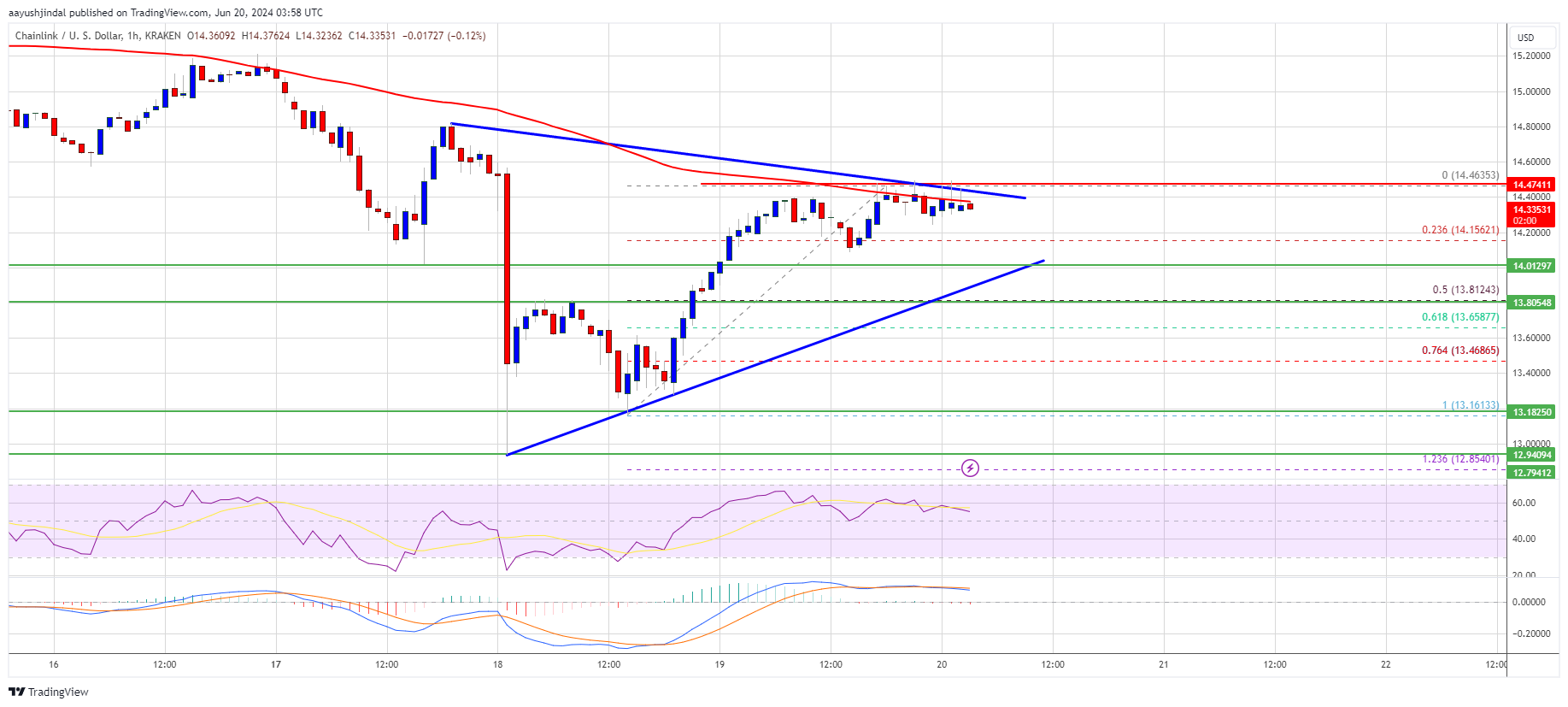 If Chainlink’s price fails to climb above the $14.40 resistance level, there could be a fresh decline. Initial support on the downside is near the $14.00 level or the triangle trend line.