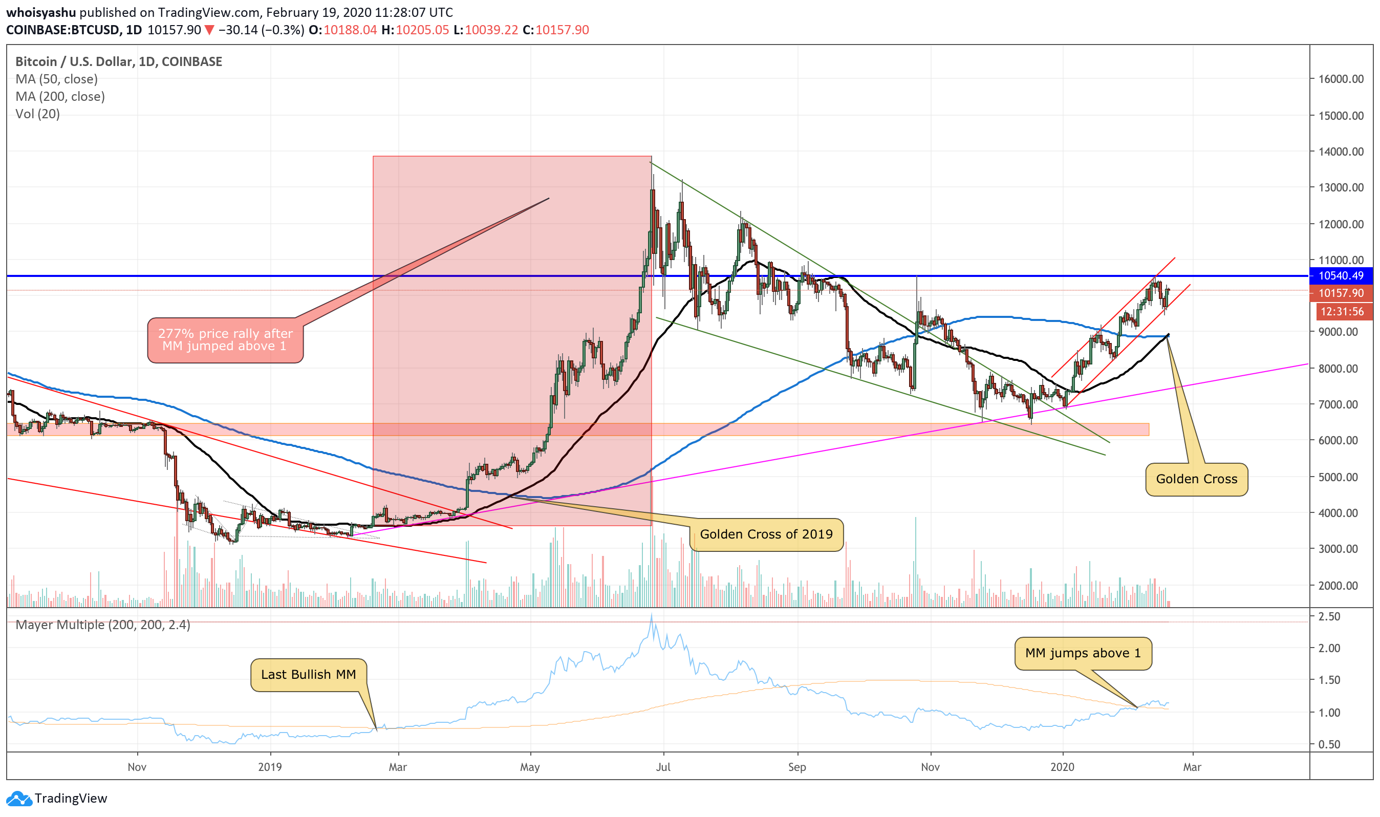 On February 4, 2020, the MM ratio closed above 1, indicating the beginning of a fresh accumulation period. The move served as a reminiscent of similar bearish flips in 2019 and 2017. In 2019, for instance, the MM suggested that bitcoin was in a bubble and – therefore – hit a local top at circa $14,000.