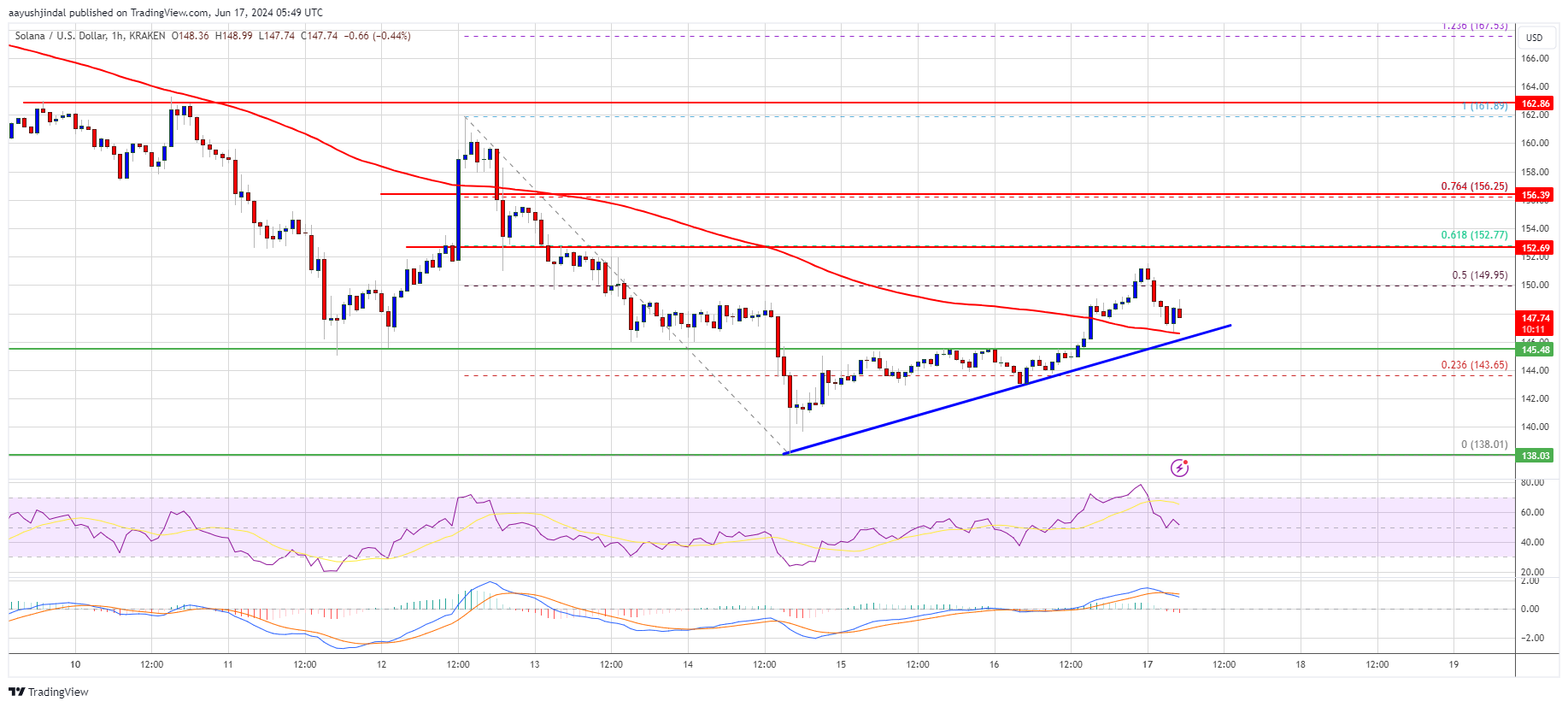 The price was able to clear the $142 and $145 resistance levels. There was a move above the 50% Fib retracement level of the downward move from the $161.89 swing high to the $138.01 low. Solana price is now trading above $145 and the 100-hourly simple moving average. There is also a connecting bullish trend line forming with support at $146 on the hourly chart of the SOL/USD pair.
