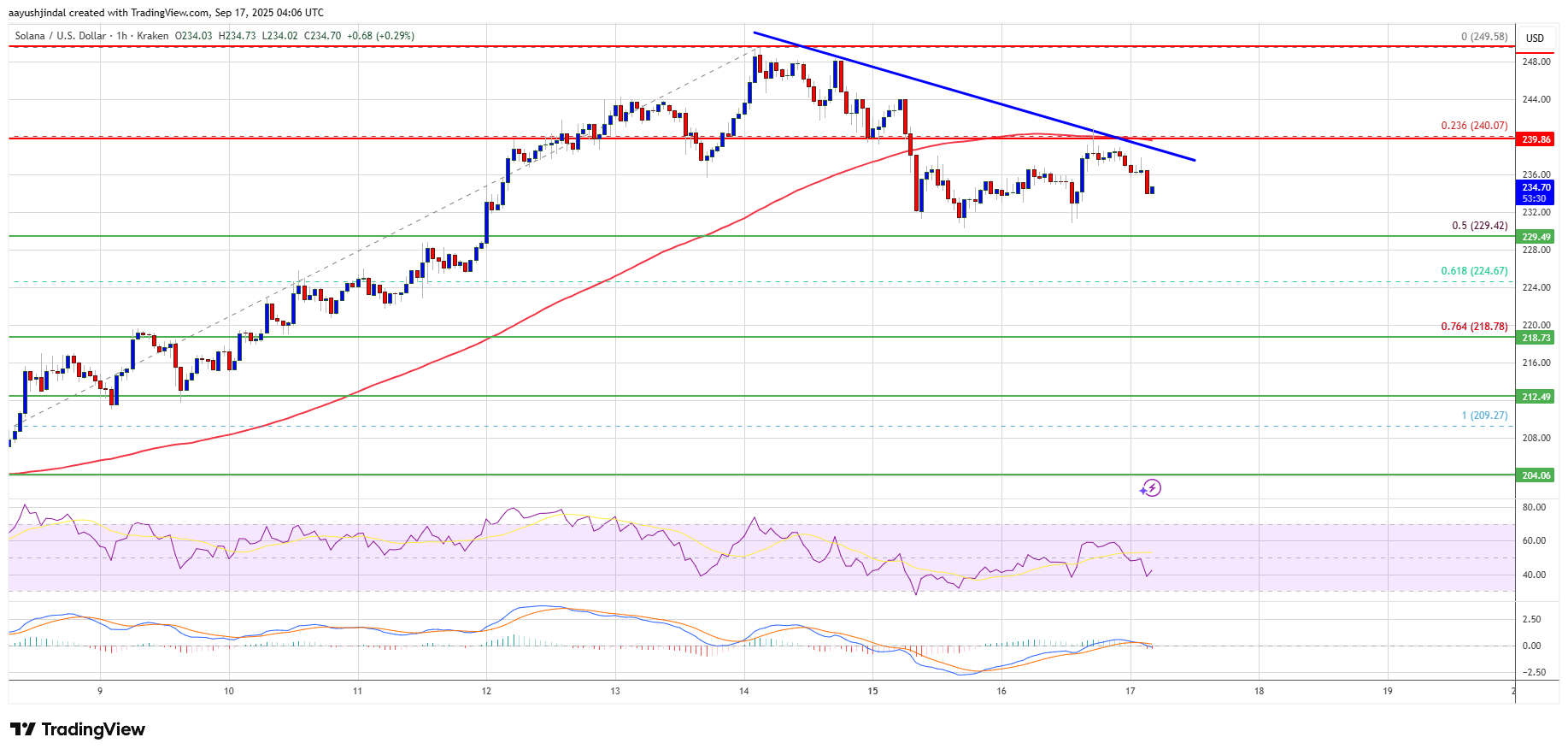 If SOL fails to rise above the $238 resistance, it could start another decline. Initial support on the downside is near the $232 zone. The first major support is near the $229 level or the 50% Fib retracement level of the upward wave from the $200 swing low to the $250 high.