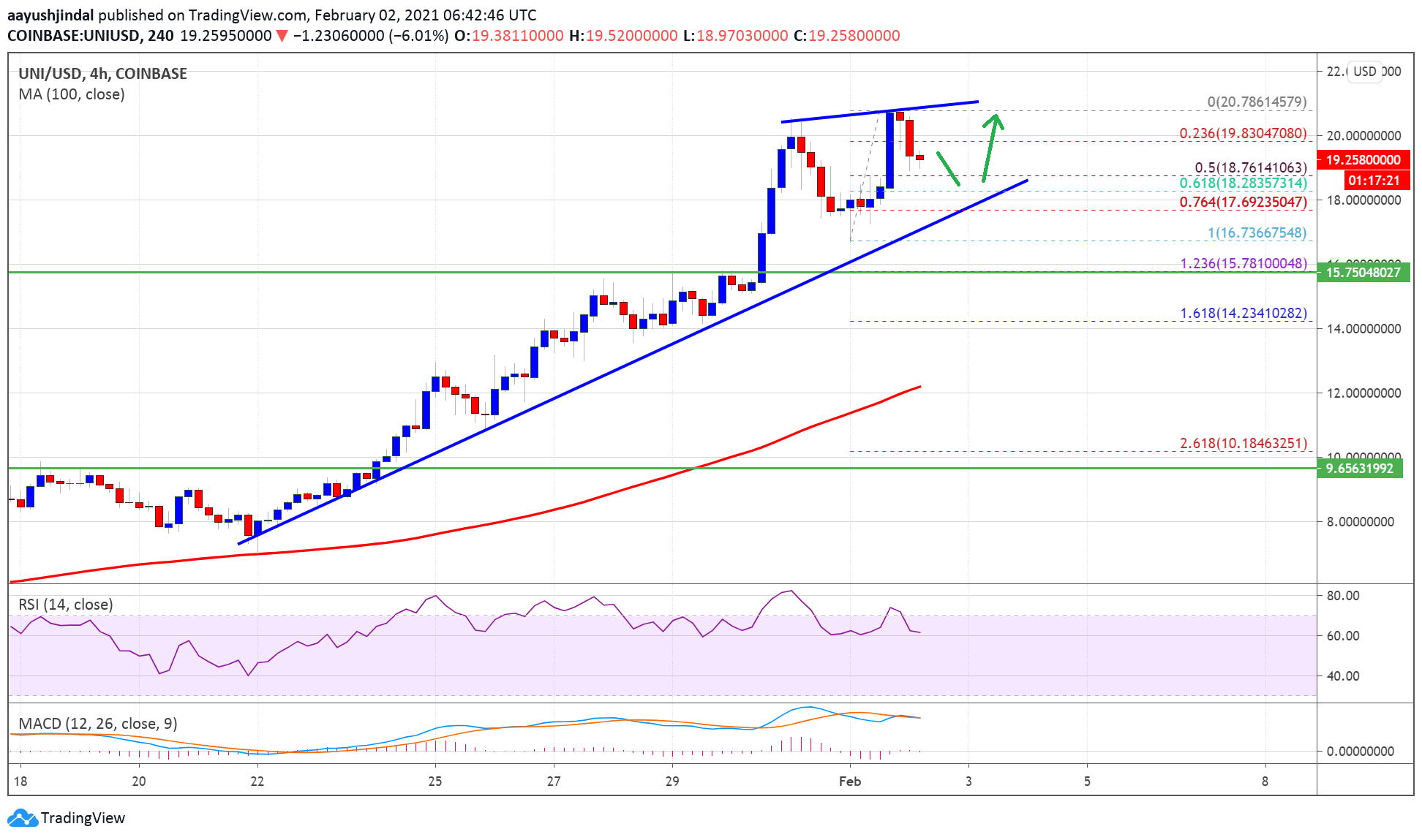 Uniswap’s UNI climbed over 10% and it even spiked above $20.00 against the US Dollar. A new all-time high is formed near $20.78 and the price is currently correcting lower.