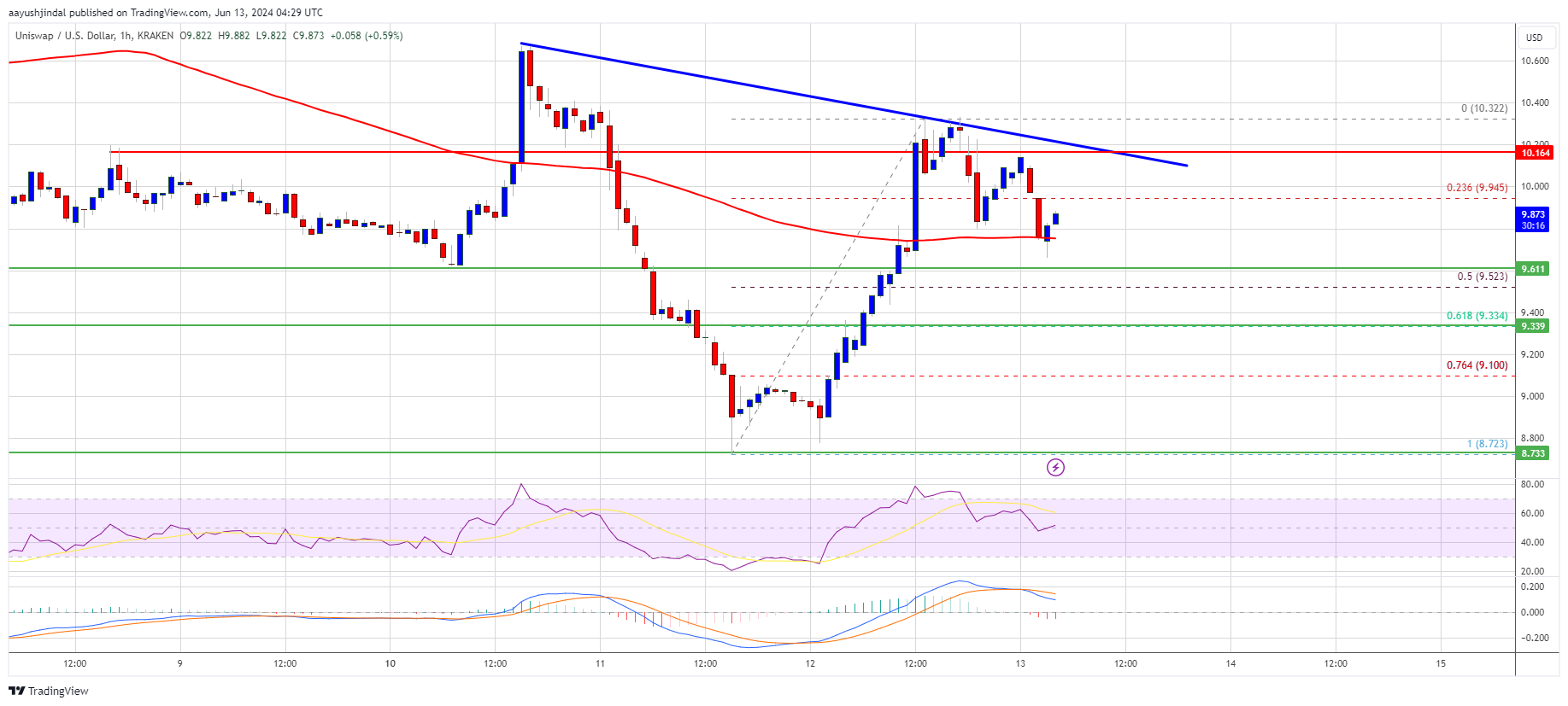 UNI is still trading above $9.50 and the 100-hourly simple moving average. Immediate resistance is near the $10.00 level. The next key resistance is near the $10.20 level. There is also a key bearish trend line forming with resistance near $10.15 on the hourly chart of the UNI/USD pair.