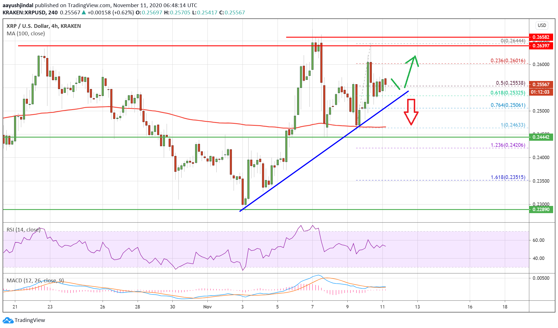 - There is a crucial bullish trend line forming with support near $0.2515 on the 4-hours chart of the XRP/USD pair (data source from Kraken).