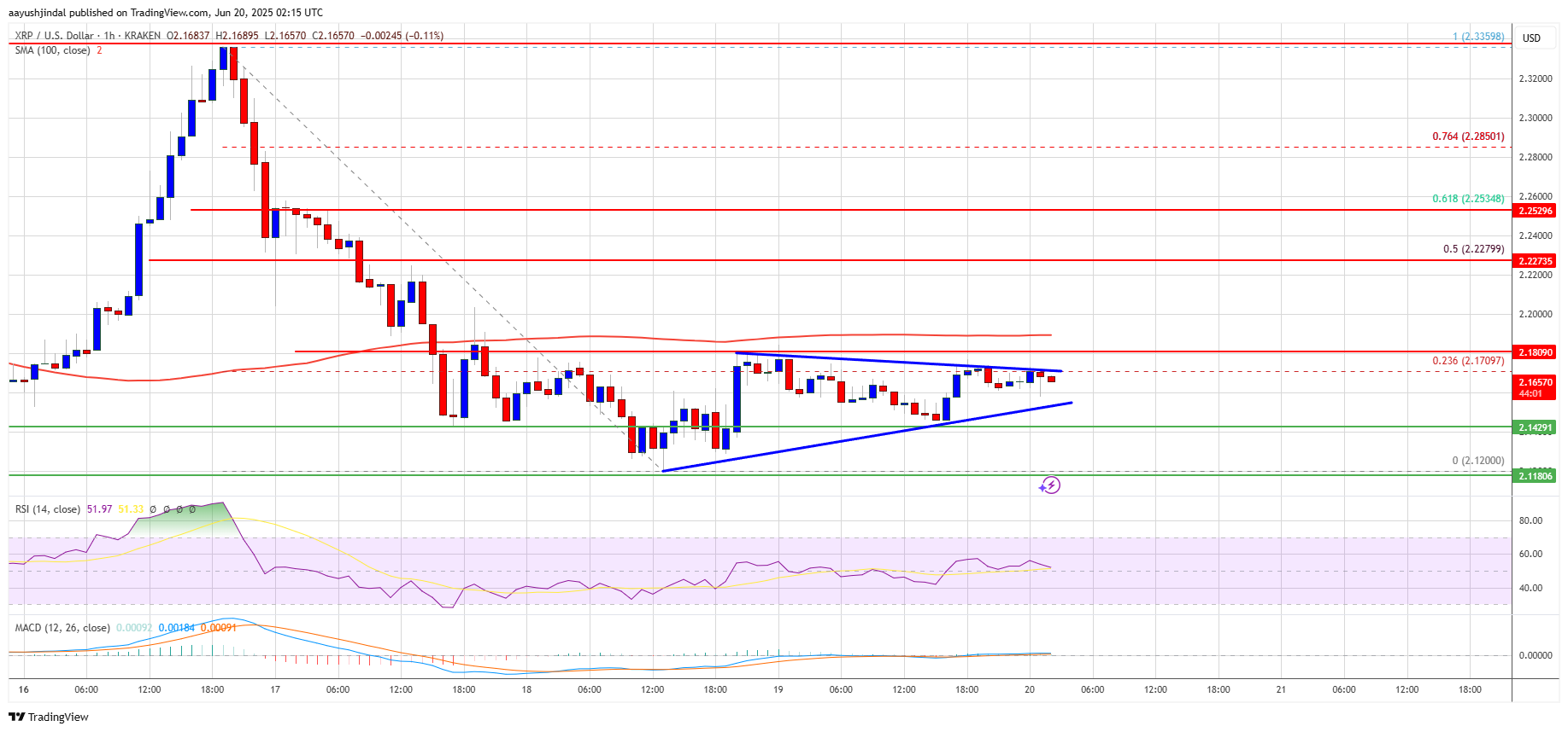 - There is a contracting triangle forming with resistance at $2.170 on the hourly chart of the XRP/USD pair (data source from Kraken).