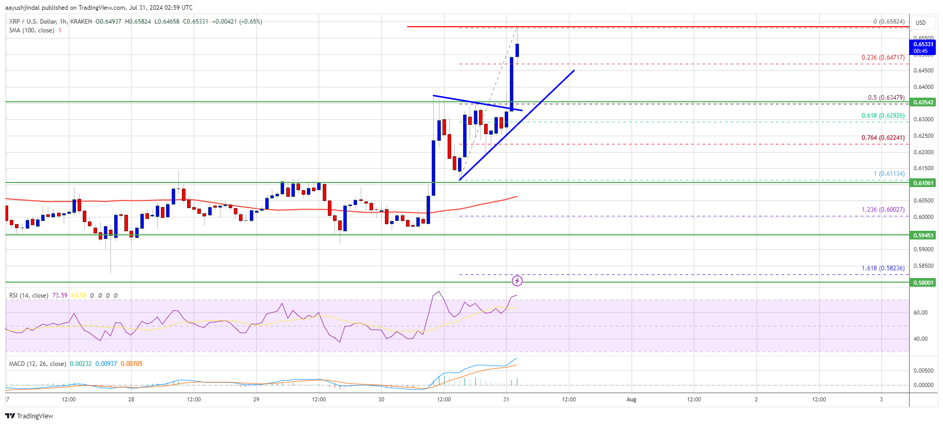 The price is now trading above $0.640 and the 100-hourly Simple Moving Average. There is also a key bullish trend line forming with support at $0.640 on the hourly chart of the XRP/USD pair. If there is a fresh increase, the price could face resistance near the $0.6580 level.