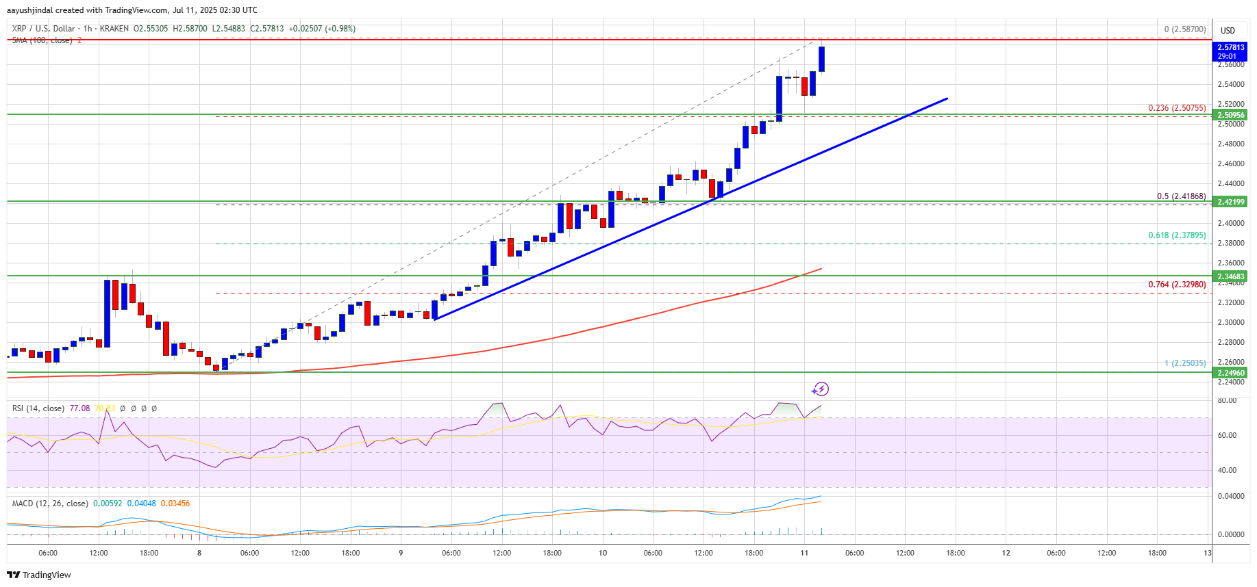 The price is now trading above $2.50 and the 100-hourly Simple Moving Average. Besides, there is a key bullish trend line forming with support at $2.50 on the hourly chart of the XRP/USD pair.