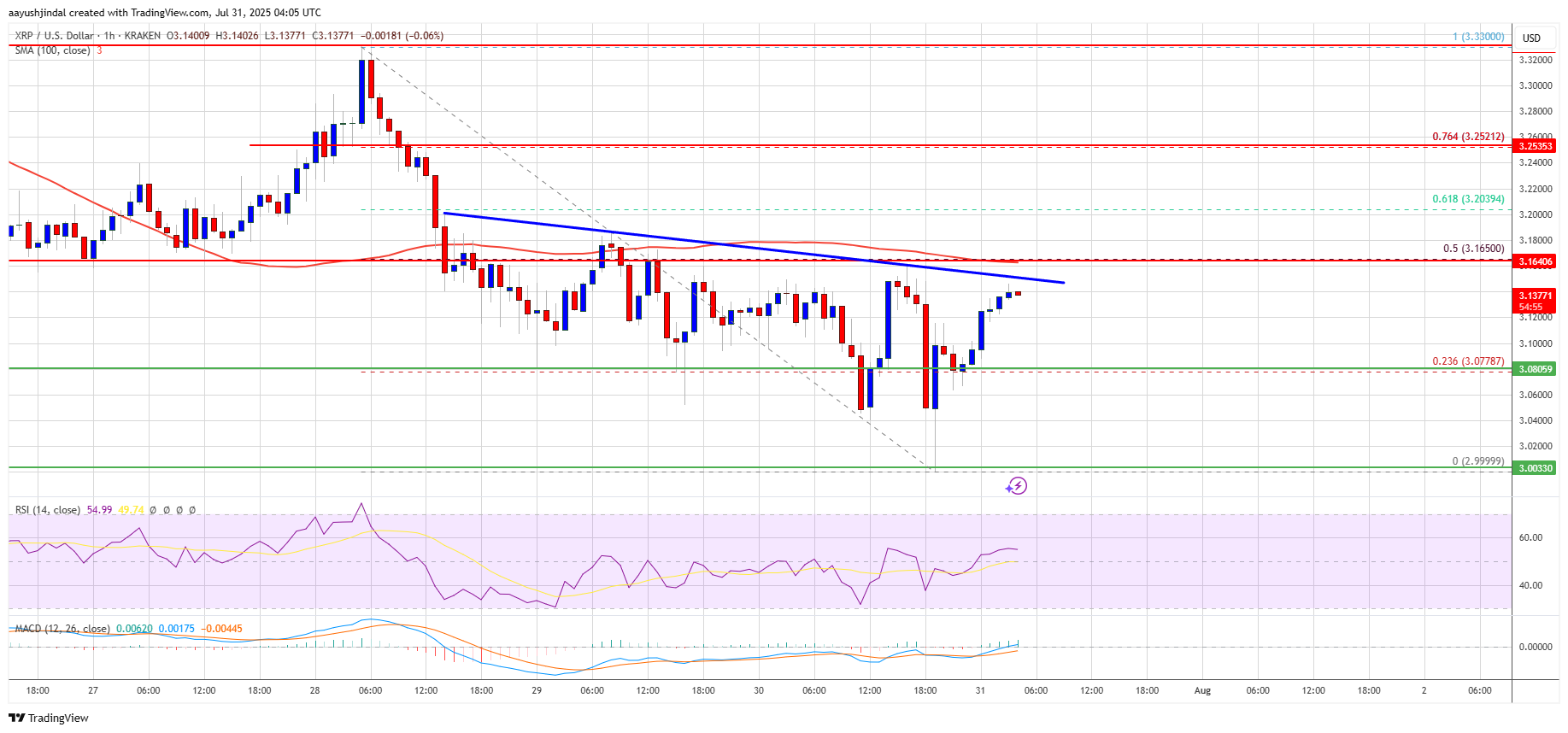 XRP price started a downside correction below the $3.120 zone. The price is now attempting a recovery and might aim for a move above the $3.1650 level.