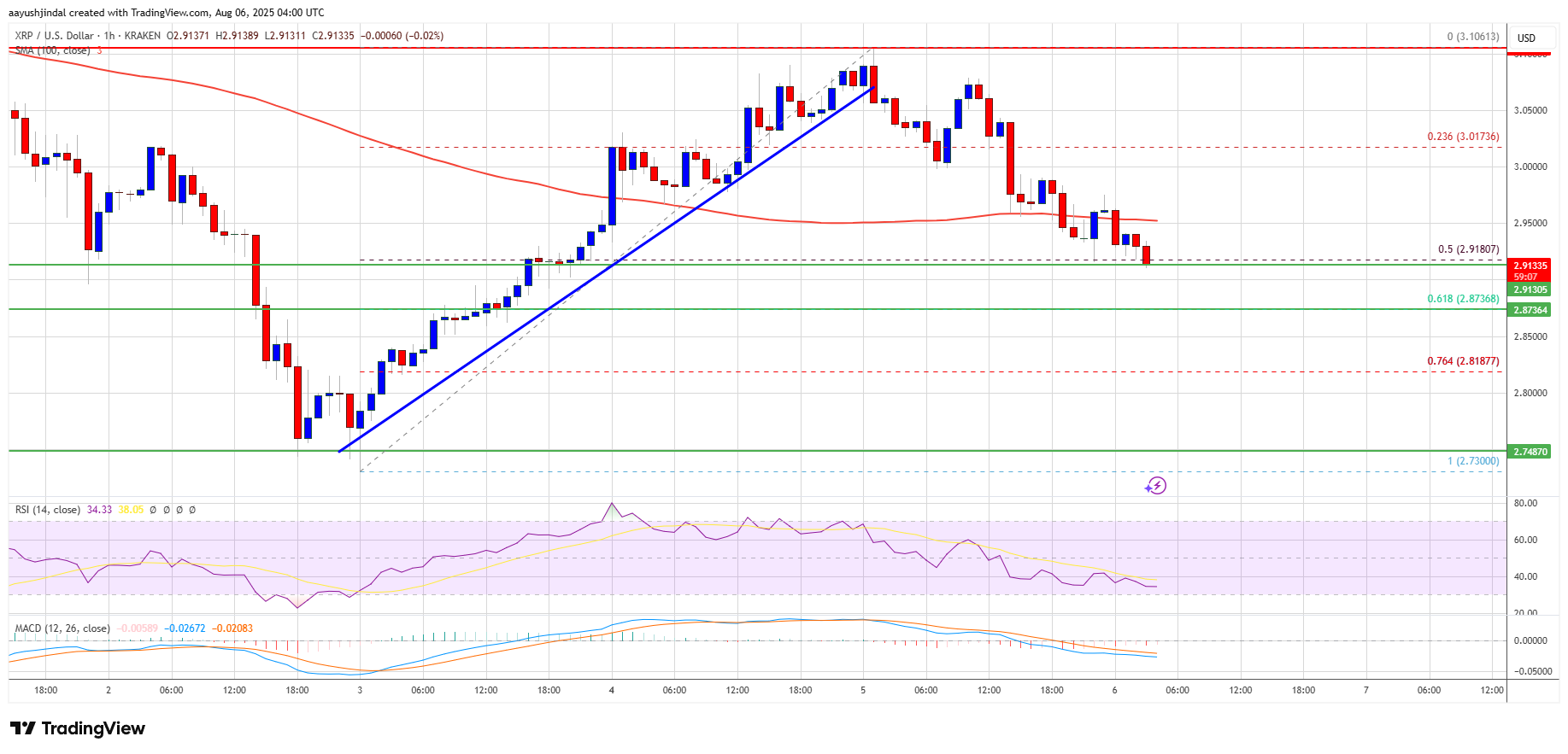 - The price is now trading below $2.980 and the 100-hourly Simple Moving Average.