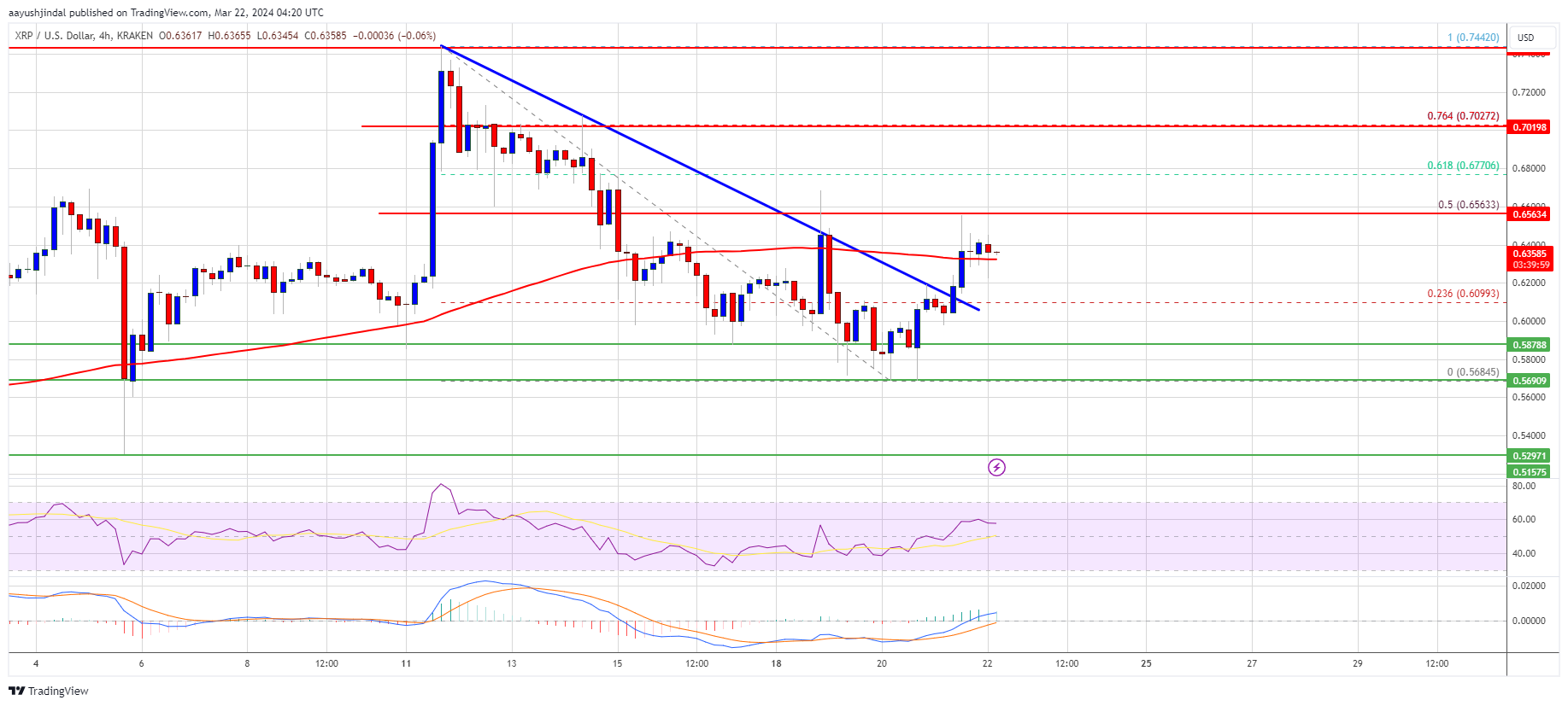 There was a move above the $0.580 and $0.600 resistance levels. The price cleared the 23.6% Fib retracement level of the downward move from the $0.7440 swing high to the $0.5684 low. There was also a break above a key bearish trend line with resistance at $0.610 on the 4-hour chart of the XRP/USD pair.