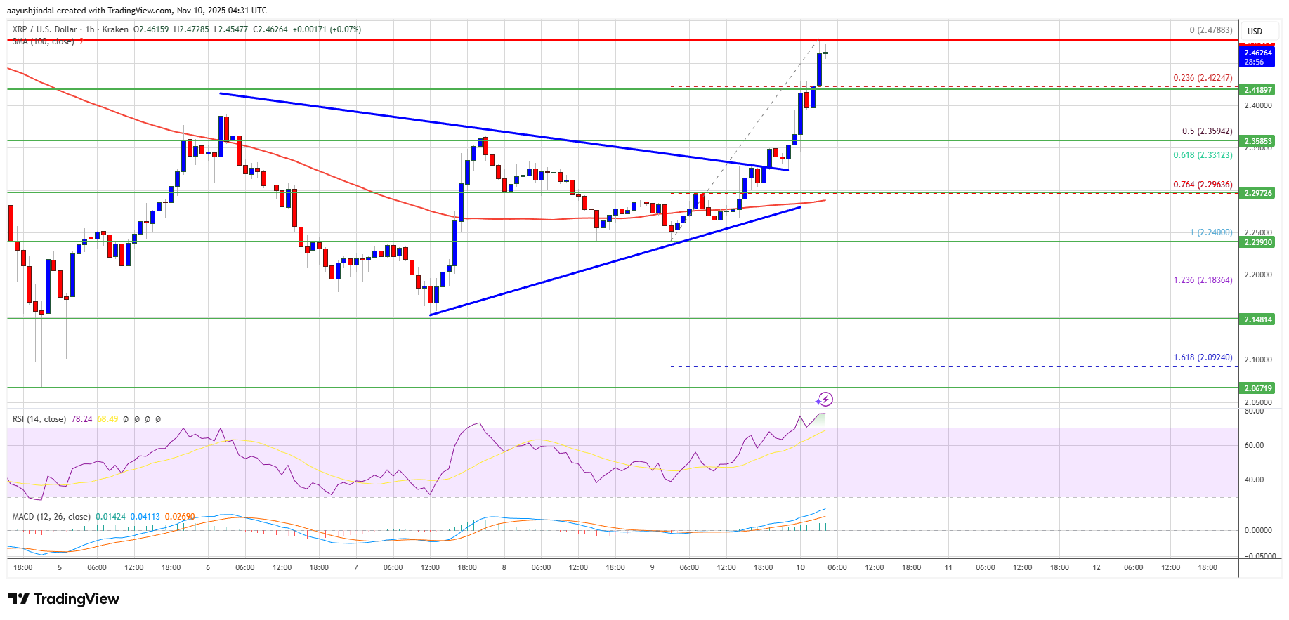 There was a break above a key contracting triangle with resistance at $2.33 on the hourly chart of the XRP/USD pair. The pair even surpassed the $2.420 barrier. A high was formed at $2.478 and the price started a consolidation phase above the 23.6% Fib retracement level of the upward move from the $2.240 swing low to the $2.478 high.
