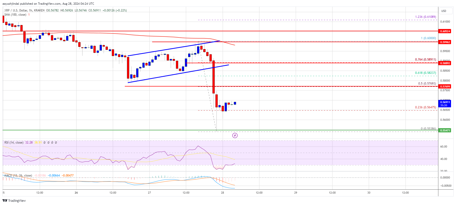 There was a break below a short-term rising channel with support at $0.590 on the hourly chart of the XRP/USD pair. The pair even spiked below the $0.5550 support level. A low was formed at $0.5538 and the price is now consolidating losses.