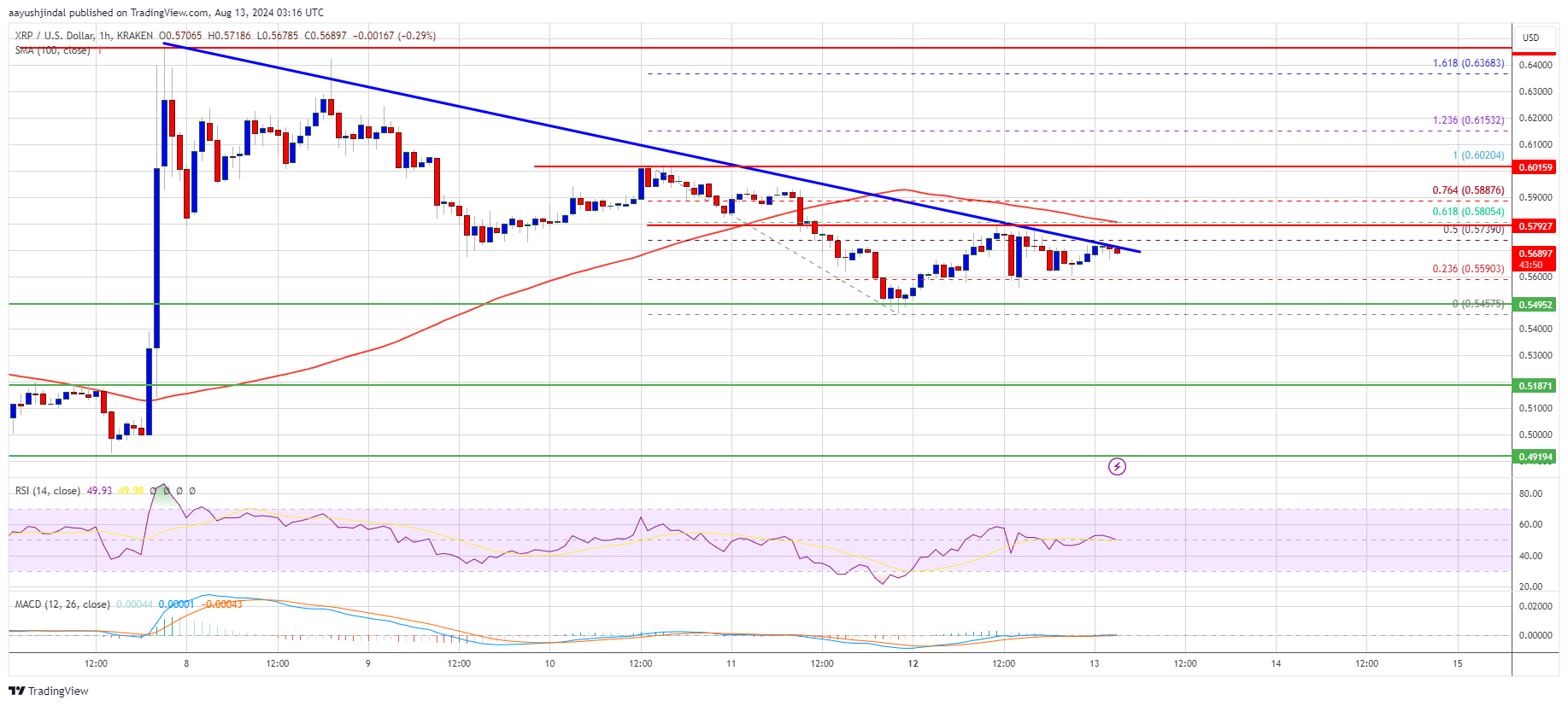 XRP price is consolidating above the $0.5450 support. The price must clear the $0.5800 resistance to start a fresh increase in the near term.