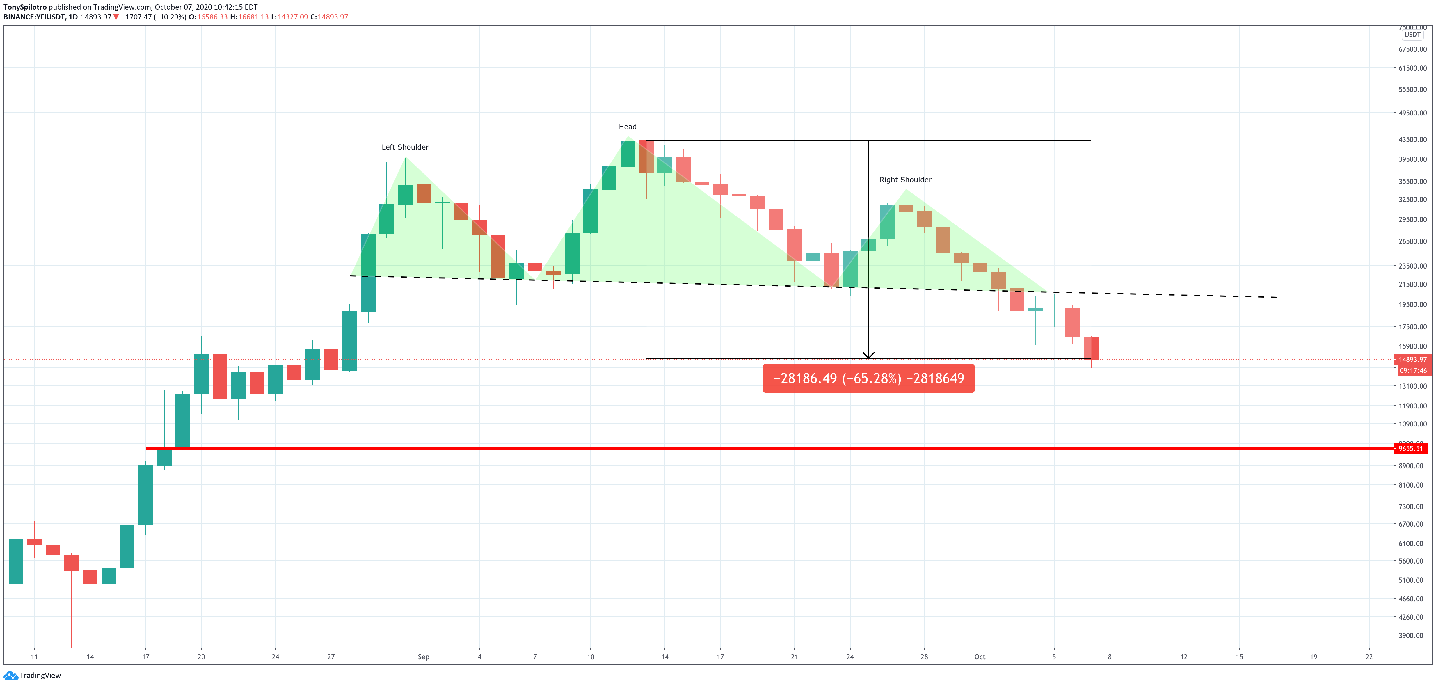 From the moment the DeFi token made its debut on Coinbase, began the “head” in a head and shoulders chart formation on YFIUSD charts. The bounce you can see above formed the right shoulder and led to a breakdown of the neckline from such strong downward momentum.