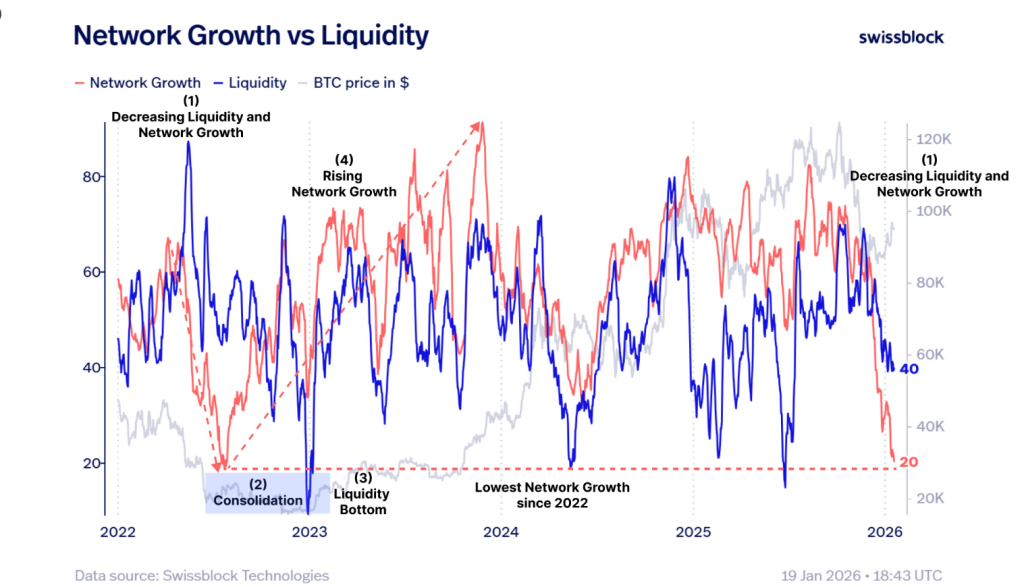 Analysts at Swissblock pointed to a fall in network growth and liquidity that looks similar to conditions seen in 2022. Back then, low liquidity and a pause in growth led to a long consolidation, only for both indicators to surge later and fuel a big price run.