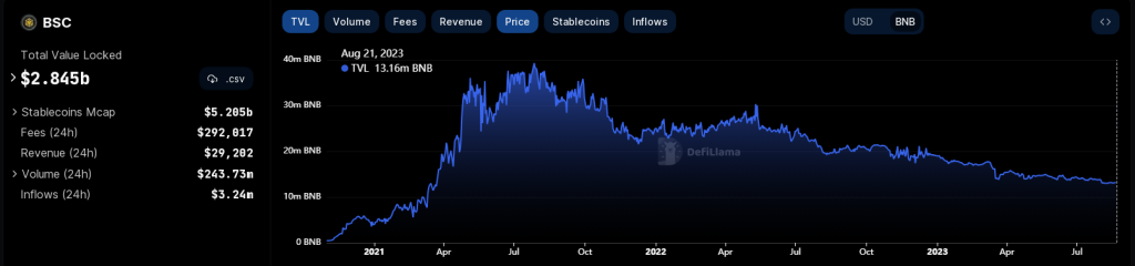 Moreover, the total value of assets within the Binance Smart Chain ecosystem has dwindled by a staggering 87%, now resting at $2.84 billion, according to DeFillama’s statistics.