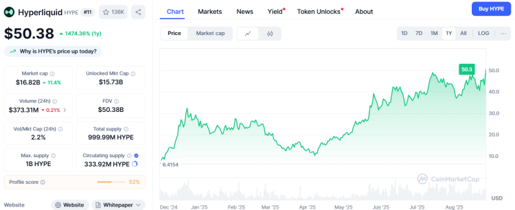 „Don’t believe the Hype“ heißt es gerne in der Unterhaltungsbranche, inspiriert vom gleichnamigen Song von Public Enemy. Doch in diesem Fall scheint der Spruch fehl am Platze. Hyperliquid erreichte gerade ein neues Allzeithoch und übersprang erstmals die 50-Dollar-Marke.