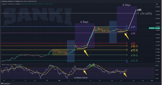 In an X post, Master Kenobi predicted that the Dogecoin price could reach a new ATH in two days. The analyst stated that Dogecoin’s 4-hour RSI chart appears to confirm his fractal setup. Based on this, he remarked that the leg up could potentially reach $0.85 by November 25th, marking a new ATH for the foremost meme coin.