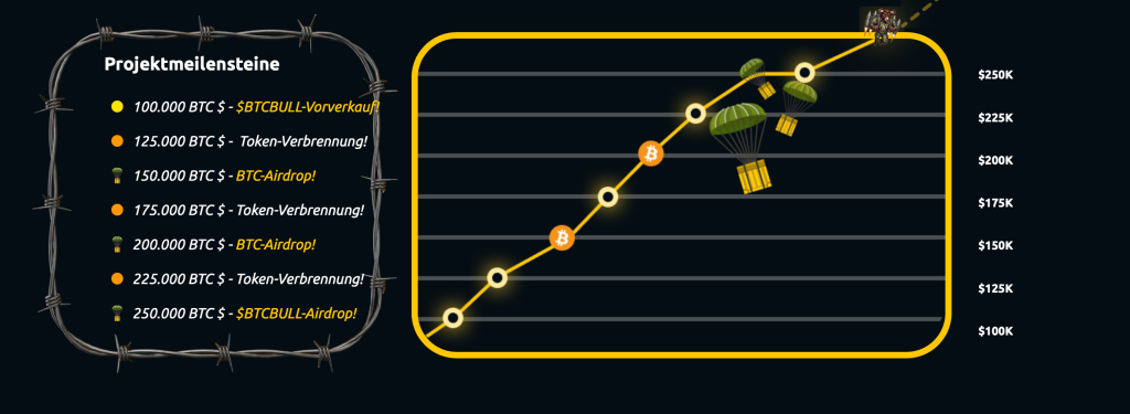 Sollte Bitcoin die Marke von 250.000 Dollar erreichen, können $BTCBULL-Inhaber bereits drei separate Bitcoin-Belohnungen erhalten. Gleichzeitig behalten sie natürlich ihre $BTCBULL-Token, die bis dahin ebenfalls deutlich im Wert steigen könnten.
