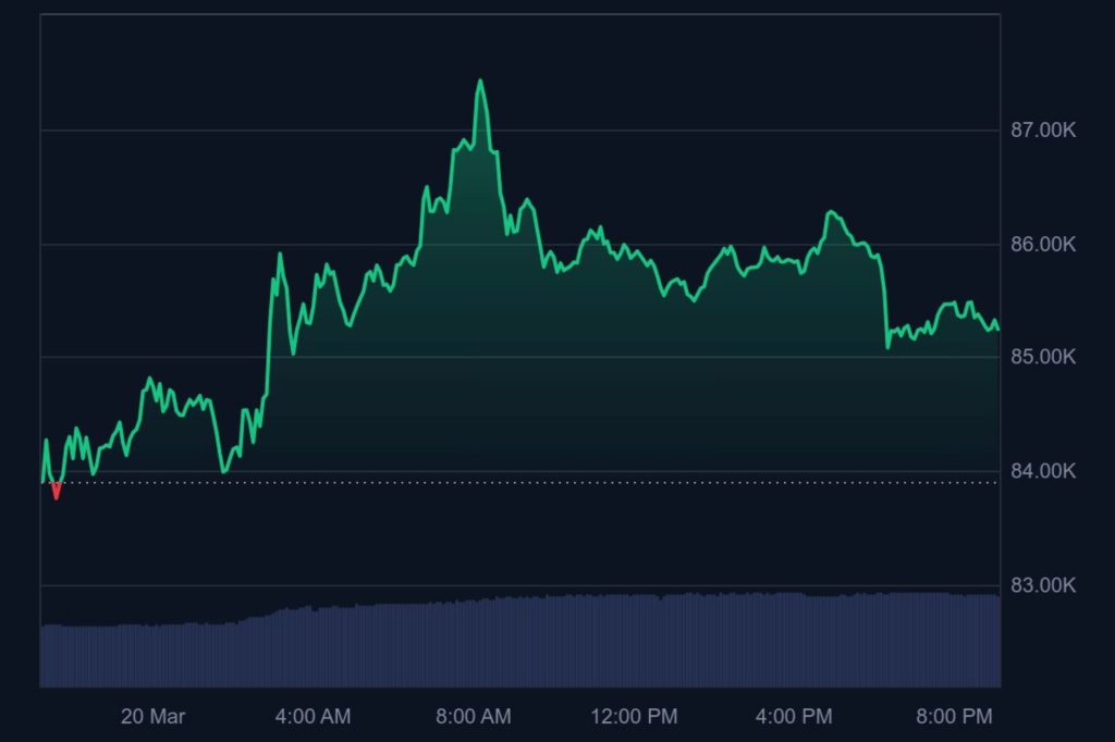Auch die Inflationsprognose der Fed wurde leicht nach oben angepasst. Von 2,5 % auf 2,7 %. Trotz dieser vorsichtigen Töne erwartet die Fed weiterhin zwei Zinssenkungen bis zum Jahresende. Eine Aussicht, die den Märkten am Donnerstag offenbar zusätzlichen Auftrieb gegeben hat. Bitcoin ($BTC) konnte daraufhin wieder auf 85.260 Dollar steigen und erreichte in den frühen asiatischen Handelsstunden sogar ein Hoch von 87.429 Dollar.