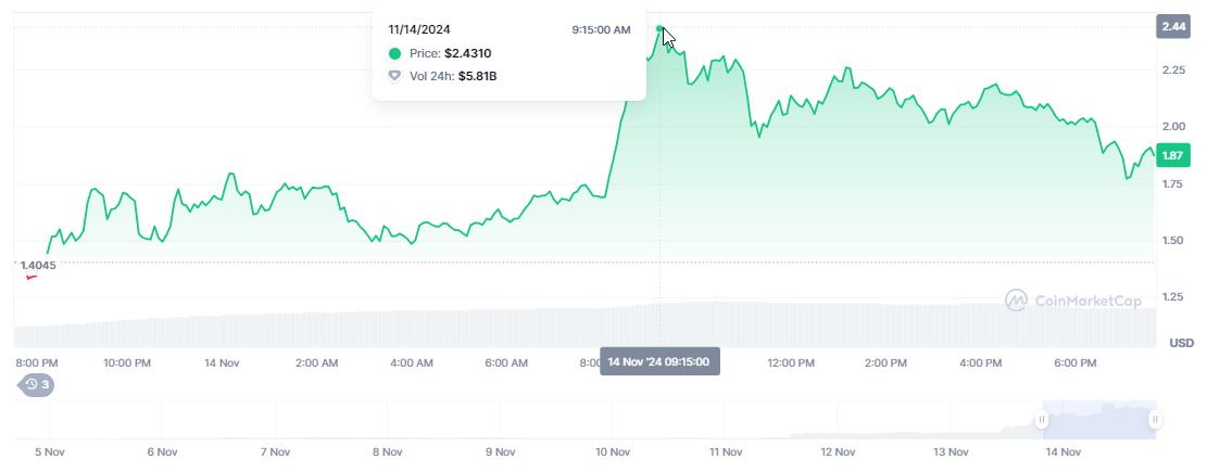 Peanut the Squirrel ha ganado protagonismo rápidamente en el sector de las criptomonedas, consolidándose como una de las principales memecoins de la cadena de bloques de Solana. En un lapso de 24 horas, PNUT se disparó casi un 200% hasta alcanzar un precio máximo histórico de 2,4 $ el 14 de noviembre, antes de estabilizarse en aproximadamente 2,23 $.