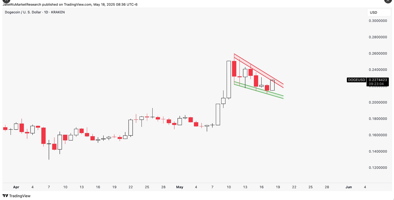 Jake Wujastyk detectó un triángulo descendente que comenzó a formarse después de que Dogecoin alcanzara los $0,26 el 11 de mayo. Los precios oscilaron entre la línea de resistencia superior y una línea de soporte inferior, estrechando la cuña. Anteriormente, DOGE subió un 8% en una sola sesión, acercándose a la línea de tendencia superior.