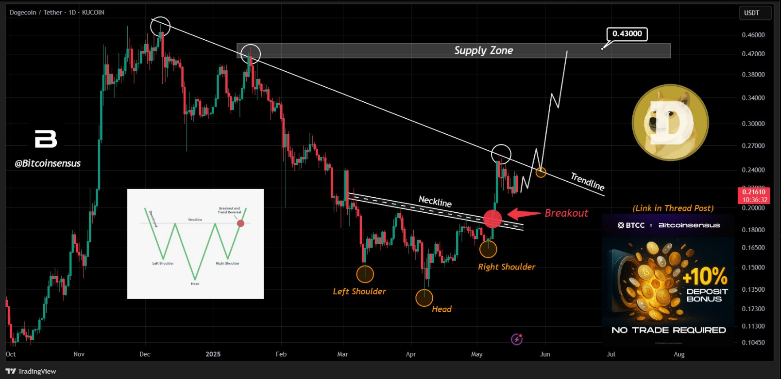Otra voz, el analista Bitcoinsensus, ve un movimiento similar a más de $0,40 pero en un patrón ligeramente diferente. Señala una cabeza y hombros inversa que se formó entre marzo y principios de mayo.