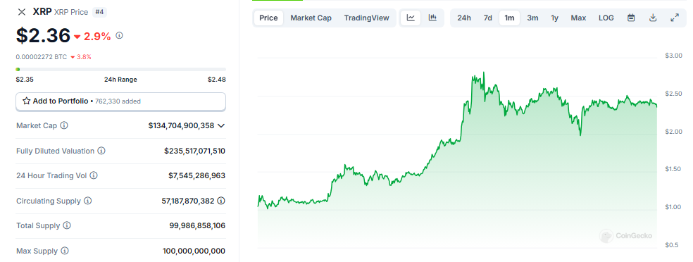 En el momento de redactar este informe, XRP se cotiza a 2,36 dólares con una capitalización de mercado total de 136.000 millones de dólares.