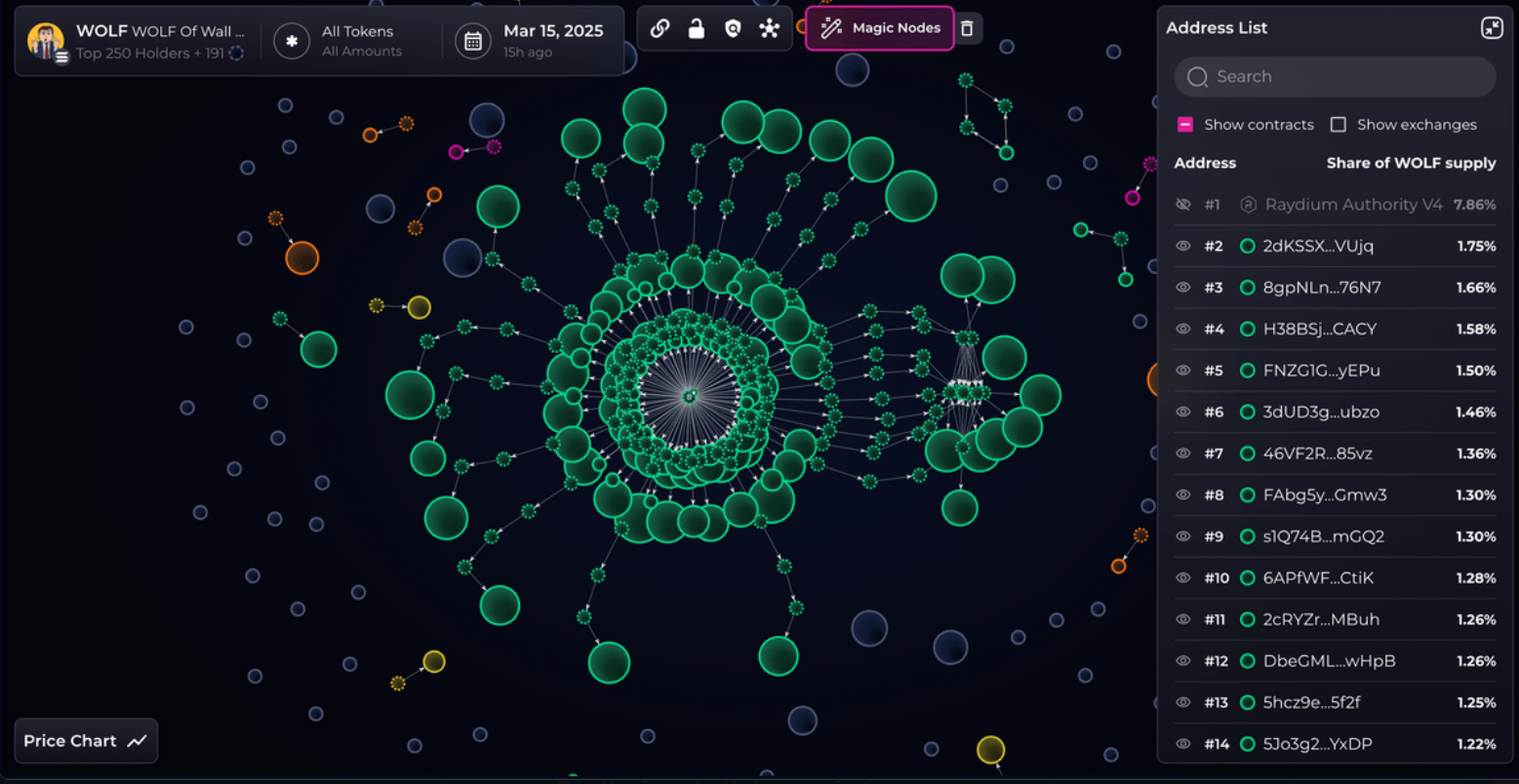 El análisis de clúster mostró que los 250 principales tenedores están vinculados a través de un puñado de direcciones. Ese patrón refleja el token WOLF, que llegó a 42 millones antes de caer a casi nada. Los analistas dicen que estos movimientos encajan con el guion clásico de una estafa, donde los primeros inversores se retiran en el pico y luego desaparecen.