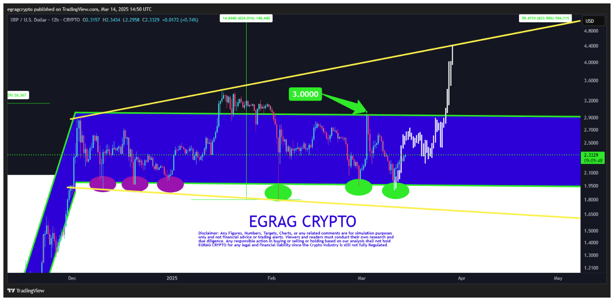 Marzo ha sido particularmente bajista para XRP, con los vendedores manteniendo el control ya que no logró recuperar el terreno perdido. Sin embargo, si los alcistas de XRP logran cerrar por encima de $3 antes de fin de mes, se abrirá la puerta para la reanudación de un repunte de precios. Con esto en mente, Egrag estableció un objetivo inicial de $4.80, colocando a XRP en nuevos máximos históricos.