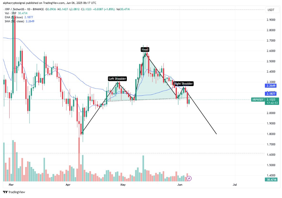 Como lo identificó un analista de criptomonedas en la plataforma de redes sociales X, XRP ahora ha impreso una formación clásica de cabeza y hombros, con una simetría claramente definida entre el hombro izquierdo, la cabeza y el hombro derecho. La formación de cabeza y hombros comenzó a tomar forma a finales de abril, cuando el precio subió a 2,26 $ para convertirse en el hombro izquierdo del patrón. A principios y mediados de mayo, XRP superó los 2,60 $ para crear la cabeza de la formación y lo que parecía en ese momento una reanudación de un fuerte impulso alcista.