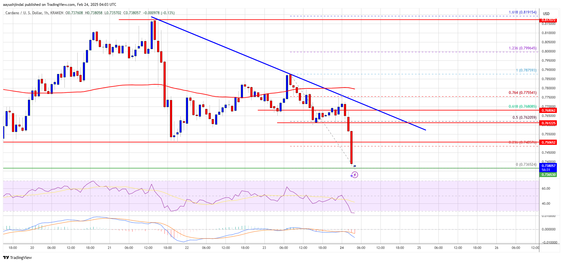 - El precio de ADA comenzó un nuevo descenso por debajo de los niveles de 0,80 y 0,7650 dólares.