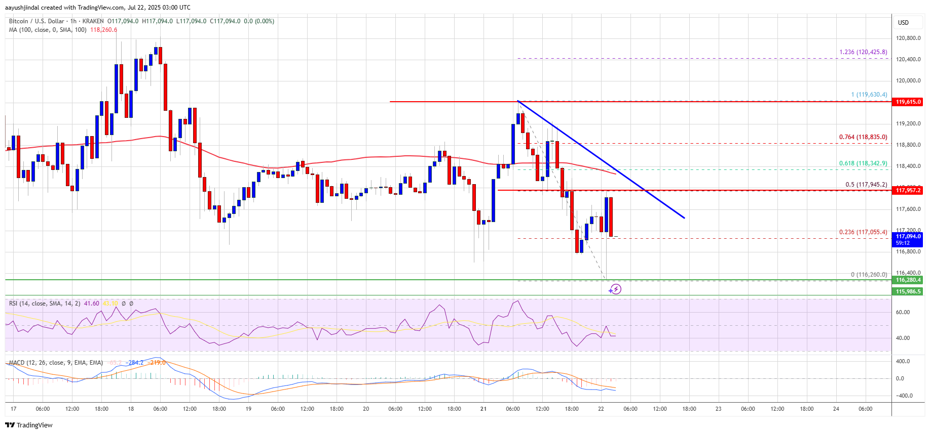 Bitcoin price started a correction after the bulls failed to clear the $120,000 resistance. BTC dipped below the $118,000 level and tested the $116,200 zone.