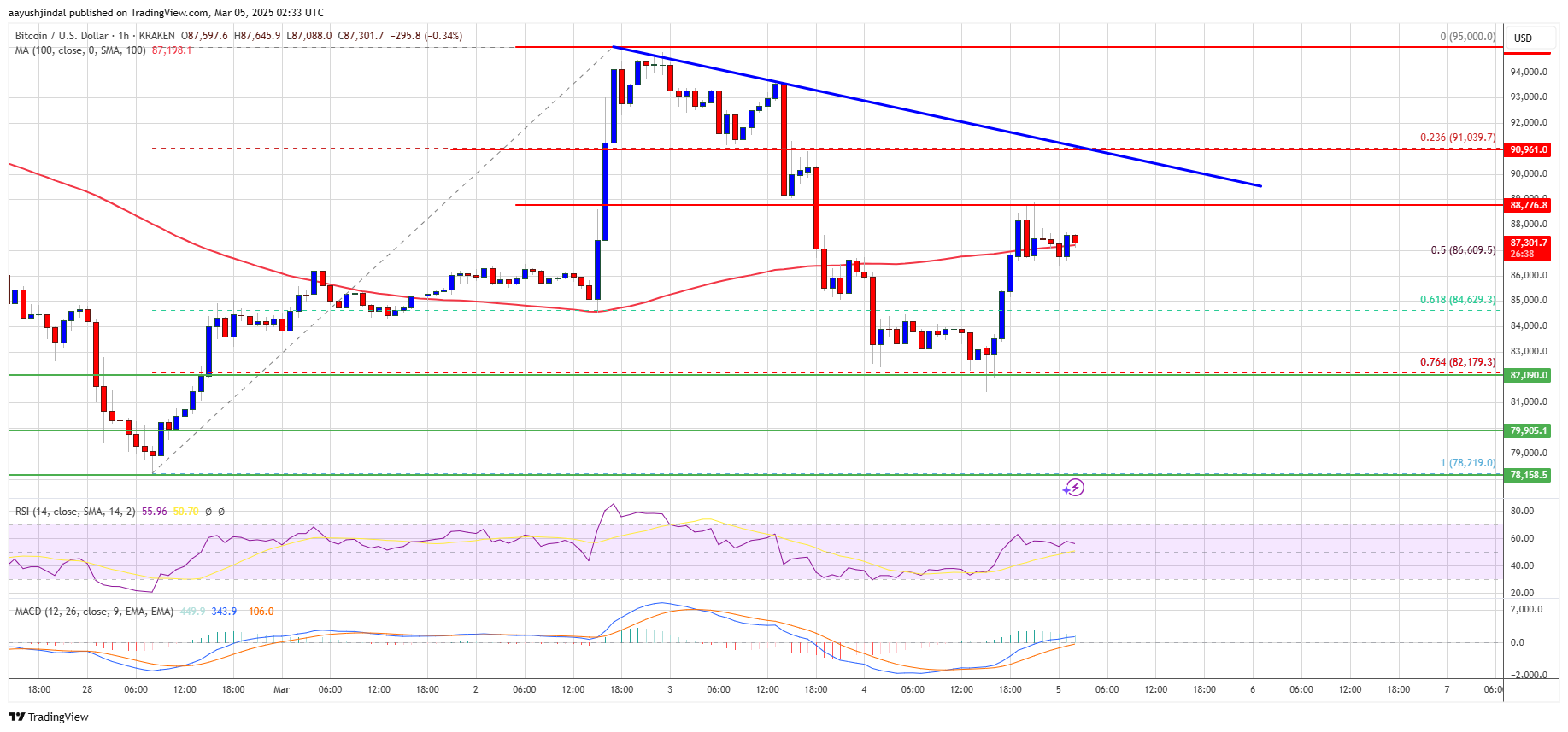 Hourly RSI (Relative Strength Index) – The RSI for BTC/USD is now above the 50 level.