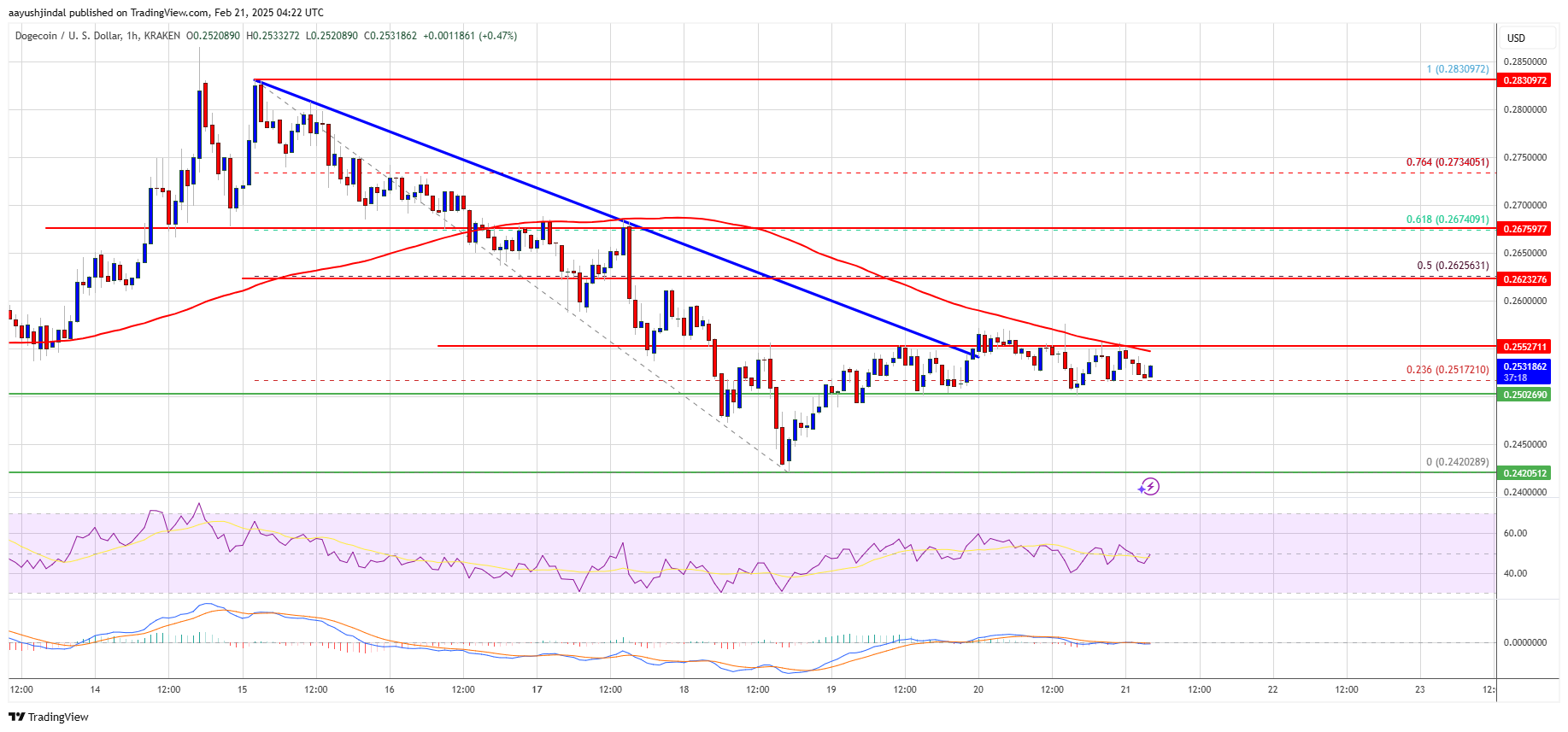 Sin embargo, el par está luchando por establecerse por encima del nivel de resistencia de 0,2550 dólares. El precio de Dogecoin ahora se negocia por debajo del nivel de 0,2540 dólares y de la media móvil simple de 100 horas. La resistencia inmediata en el lado positivo está cerca del nivel de 0,2550 dólares.