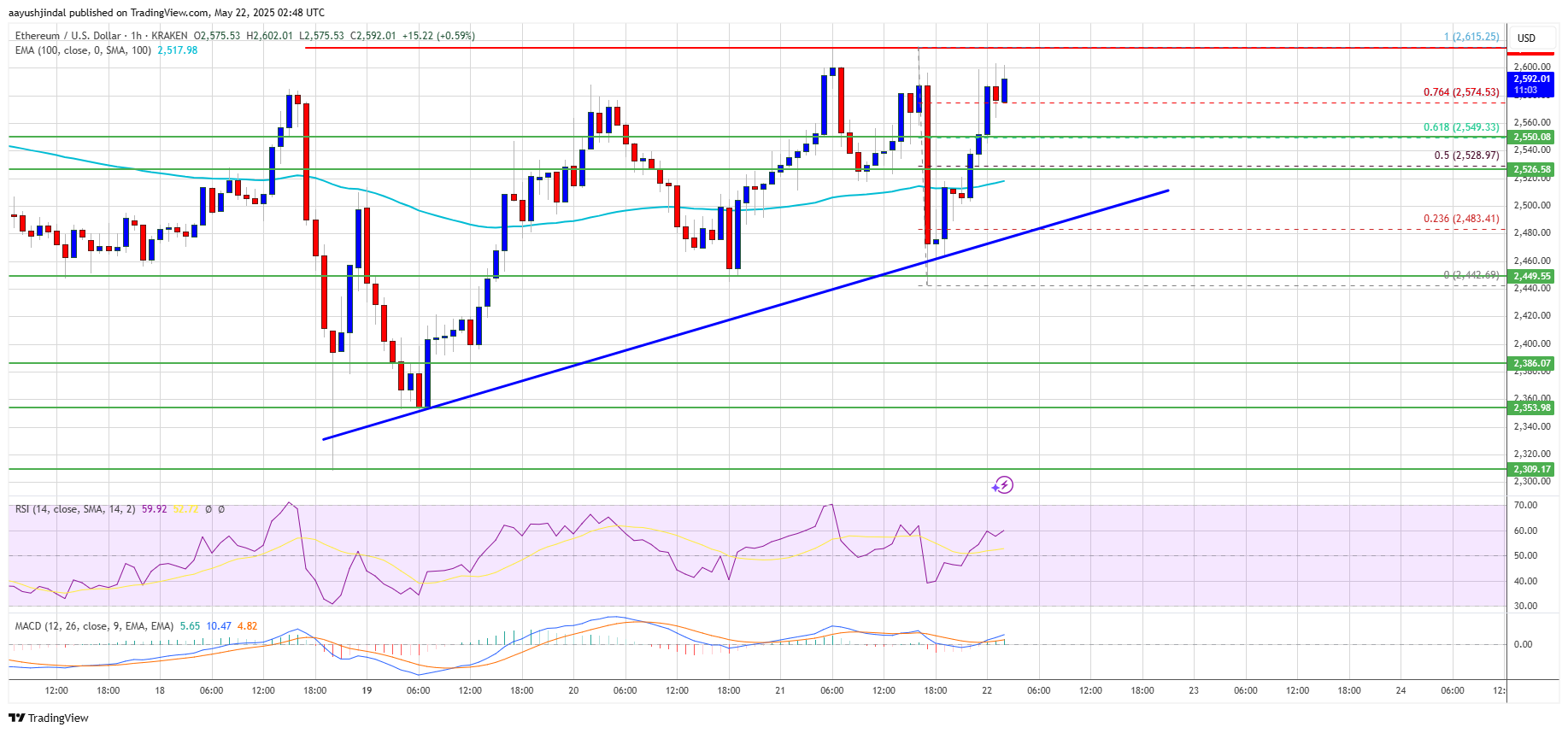 Ethereum price is now trading above $2,520 and the 100-hourly Simple Moving Average. It is also above the 76.4% Fib retracement level of the downward wave from the $2,615 swing high to the $2,442 low.