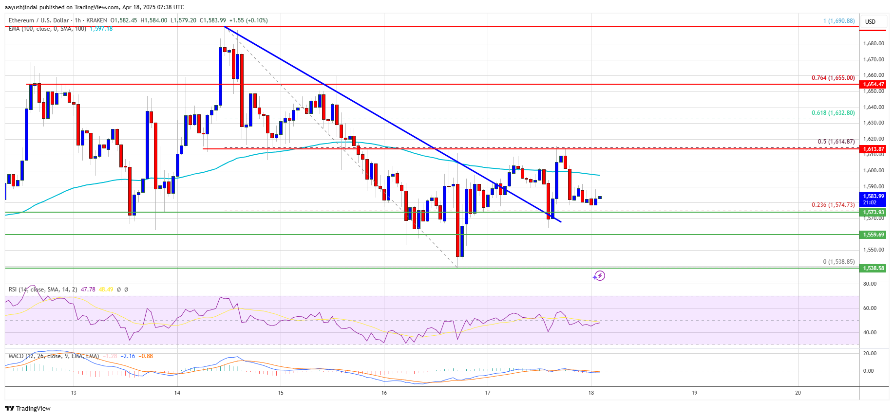 If Ethereum fails to clear the $1,615 resistance, it could start another decline. Initial support on the downside is near the $1,5750 level. The first major support sits near the $1,540 zone.