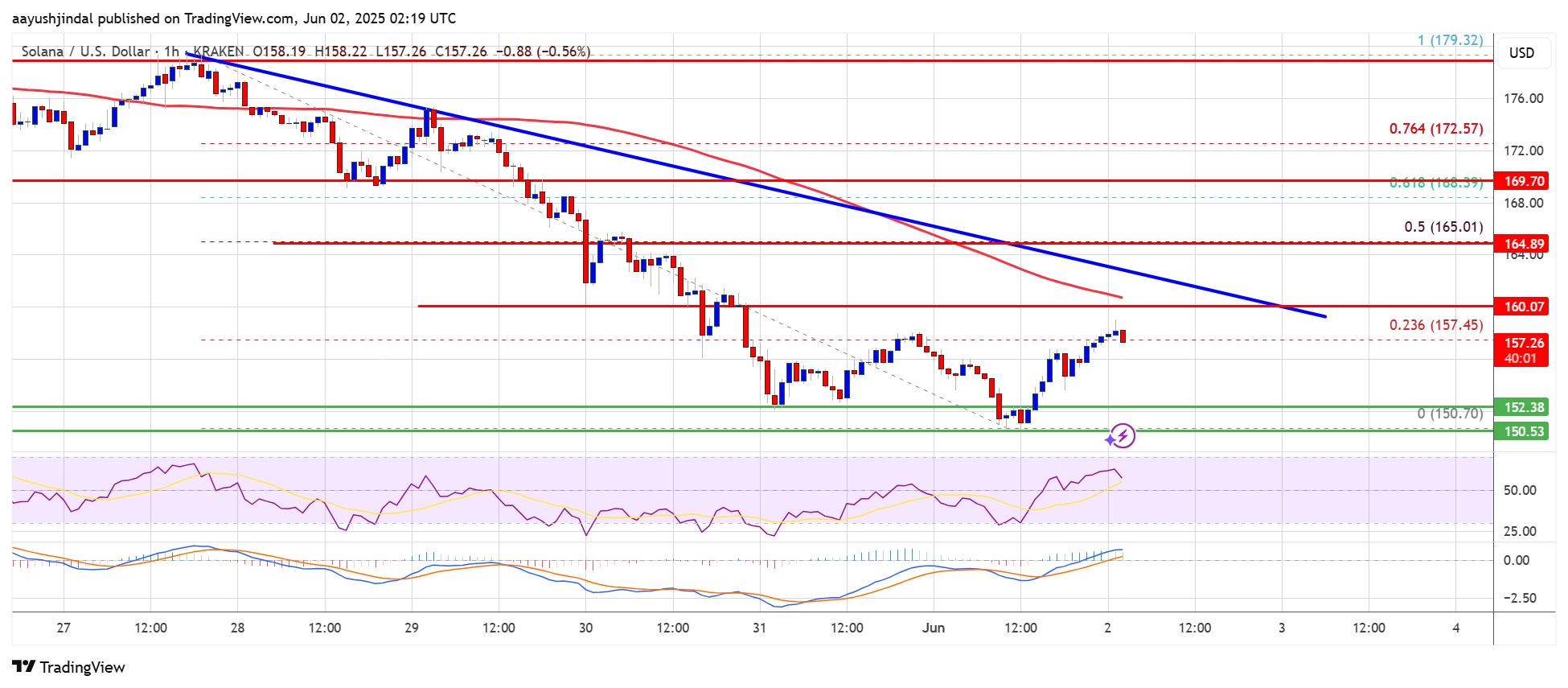 Solana ahora se cotiza por debajo de $160 y la media móvil simple de 100 horas. También se está formando una línea de tendencia bajista clave con resistencia en $160 en el gráfico horario del par SOL/USD.