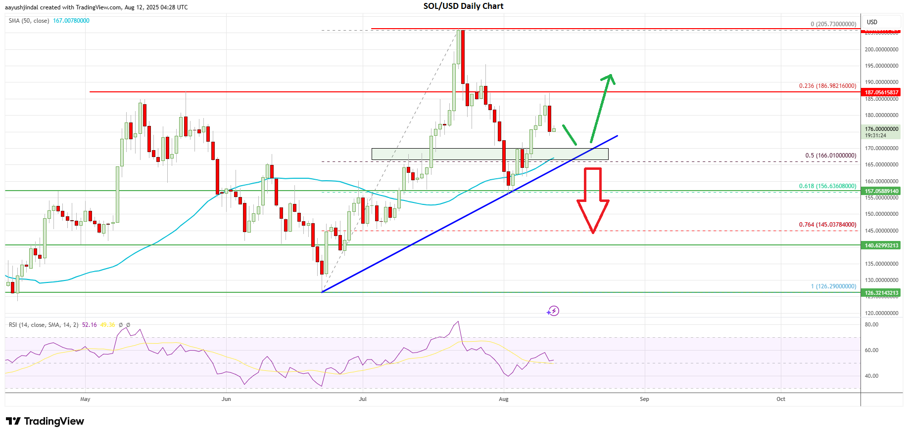 Si SOL no logra subir por encima de la resistencia de $200, podría comenzar otro descenso. El soporte inicial a la baja está cerca de la zona de $194. El primer soporte importante está cerca del nivel de $186 o el nivel de retroceso de Fibonacci del 50% del movimiento alcista desde el mínimo de $173 hasta el máximo de $199.