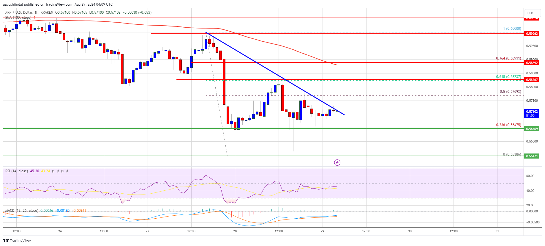- Se está formando una línea de tendencia bajista clave con una resistencia en 0,5720 dólares en el gráfico horario del par XRP/USD (datos de Kraken).