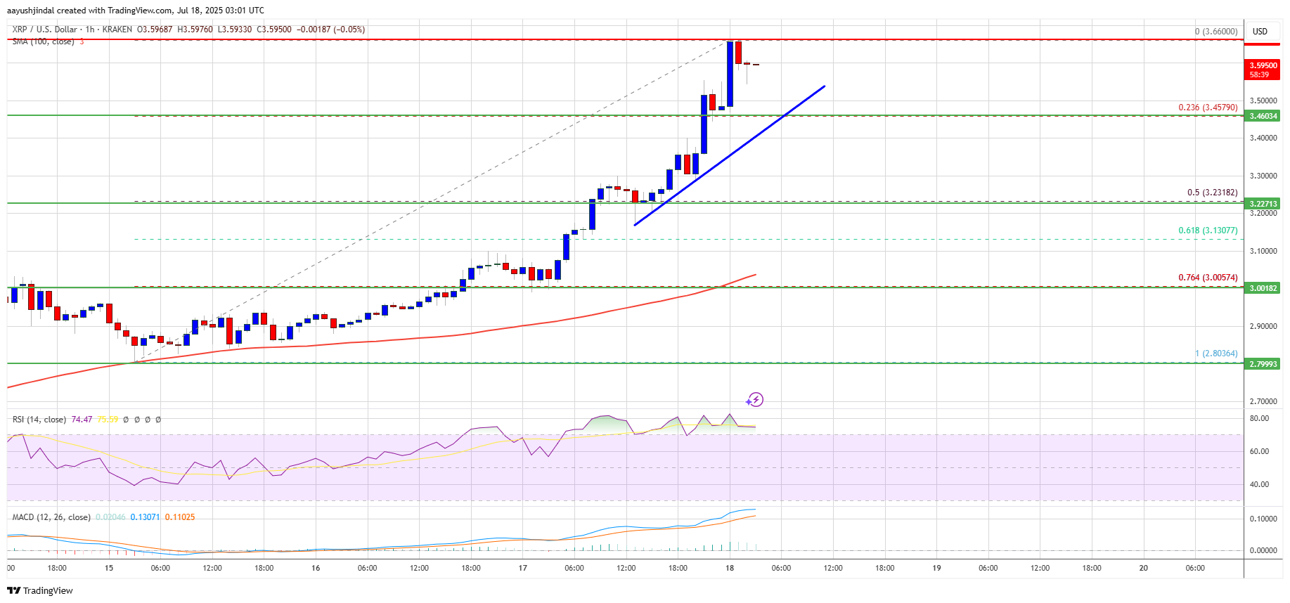 XRP price started a fresh increase and surged above the $3.350 zone. The price is now consolidating gains and might continue to rise above the $3.60 zone.