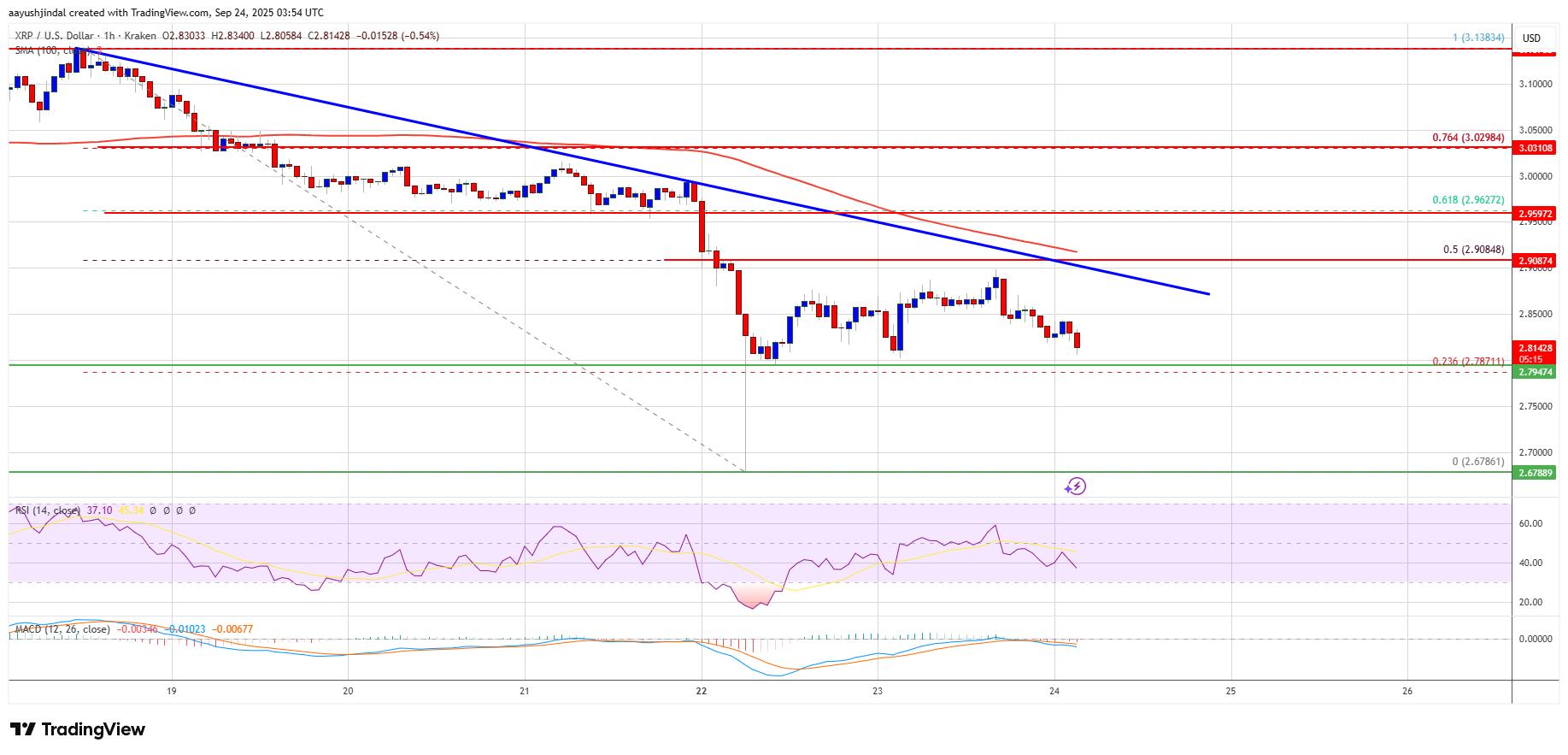 El precio de XRP inició un nuevo descenso por debajo de la zona de $2.90. El precio ahora muestra signos bajistas y podría volver a caer por debajo de la zona de $2.780.