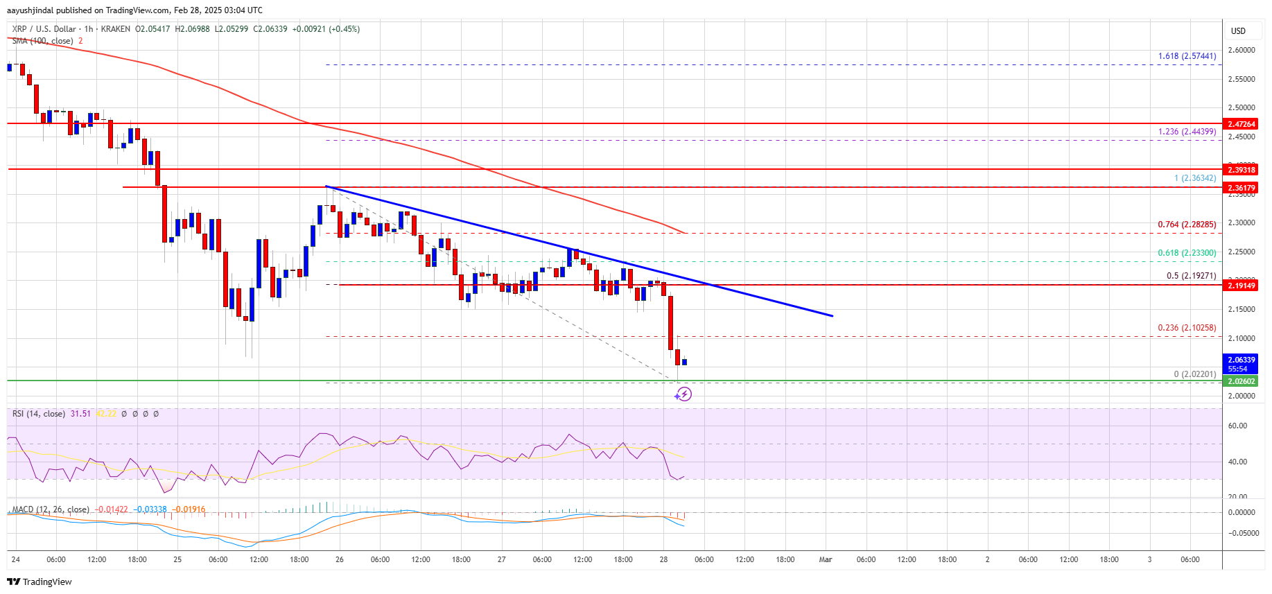 The price even dipped below the $2.120 support to enter a bearish zone. A low was formed at $2.0220 and the price is now struggling to stay above $2.0. The price is showing many bearish signs below the 23.6% Fib retracement level of the downward move from the $2.363 swing high to the $2.022 low.