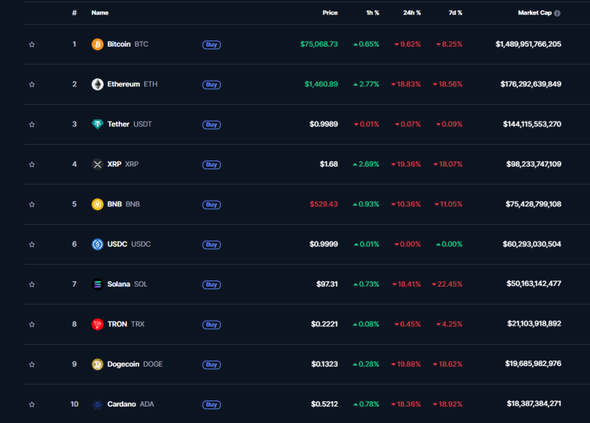 El precio de Bitcoin cayó por debajo de los $75,000 el lunes 7 de abril, su nivel más bajo desde mediados de marzo, como reacción de los inversores a la escalada de tensiones en las relaciones comerciales entre Estados Unidos y China. La moneda digital perdió alrededor del 6% en 24 horas, según datos de CoinMarketCap, como parte de una venta masiva más amplia en los mercados criptográficos y tradicionales.